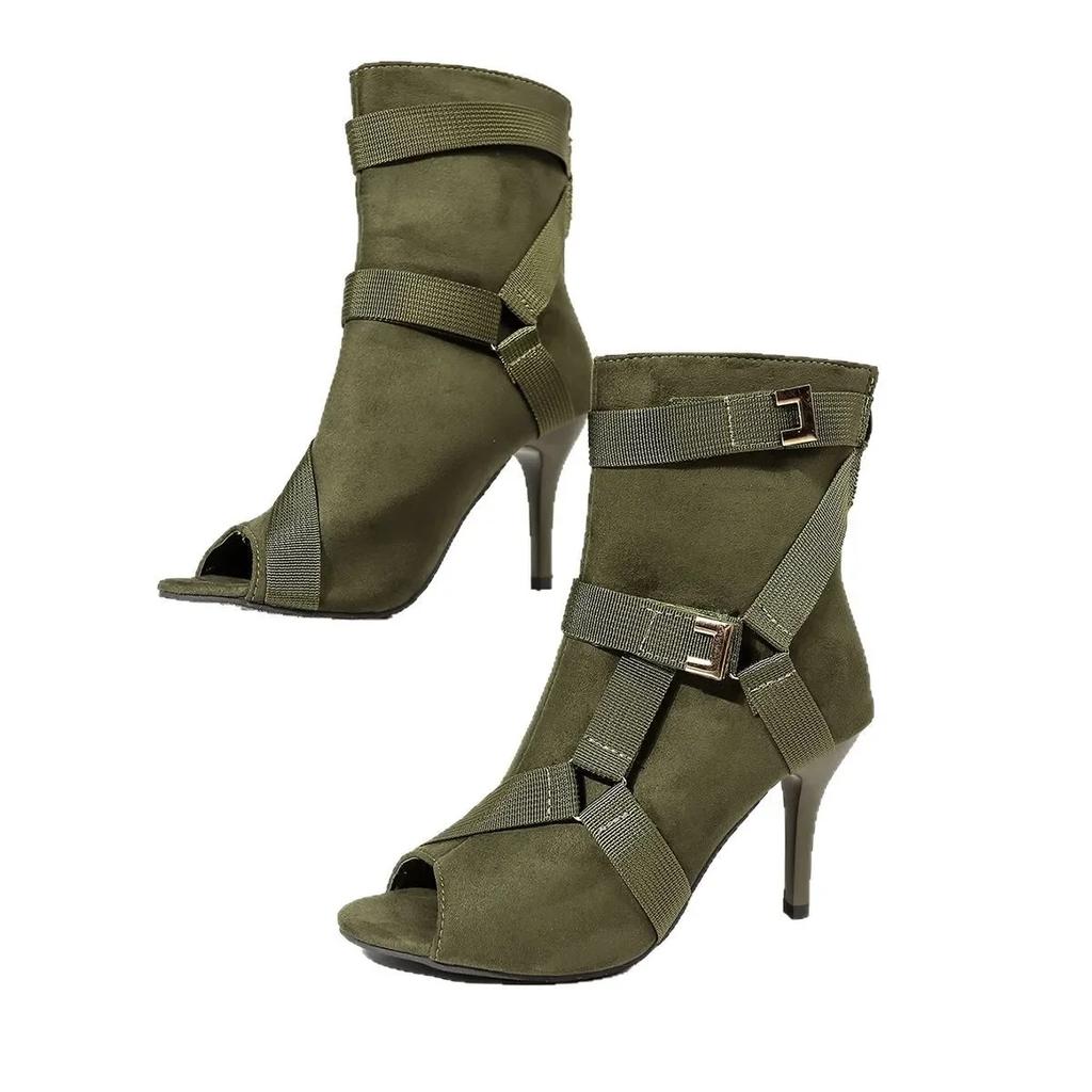 Модные ботильоны на щиколотке с круглым открытым носком, ремешком с пряжкой, армейского зеленого цвета, с перекрестными ремешками и тонкими каблуками, весенне-осенние, современные короткие ботильоны