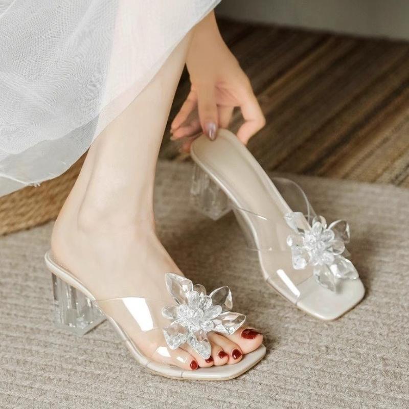 Мода 2025 Новые женские сандалии с цветком из водных бриллиантов на прозрачной толстой подошве, тапочки для вечеринки, платья, мюли, на высоком каблуке