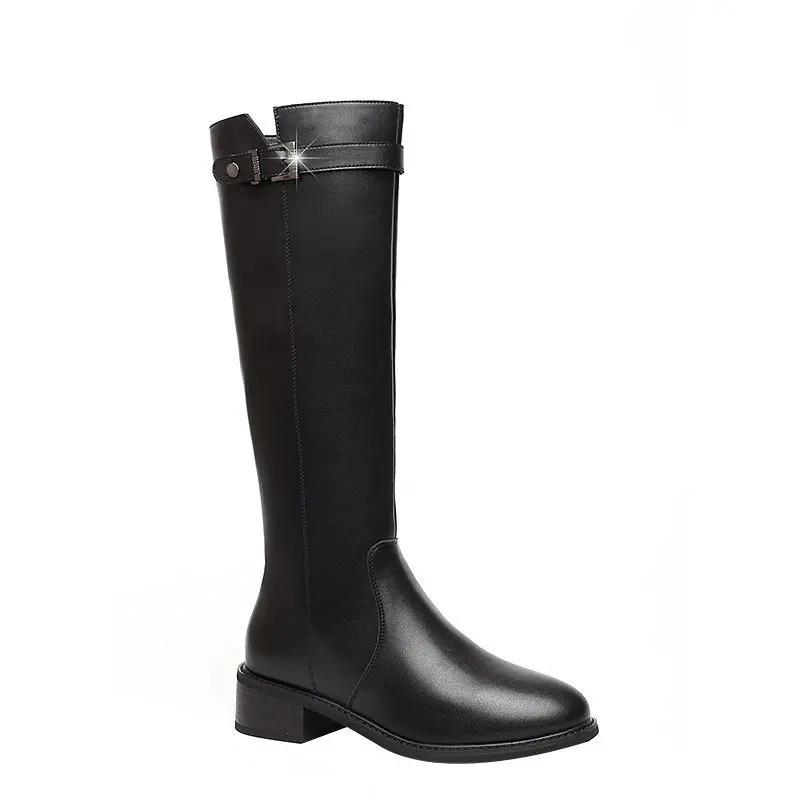 Осень/Зима Новые Женские Длинные Сапоги Теплые На Низком Каблуке Боковая Молния Пряжка Ремня Стройнящие Сапоги До Колена Черные Рыцарские Сапоги