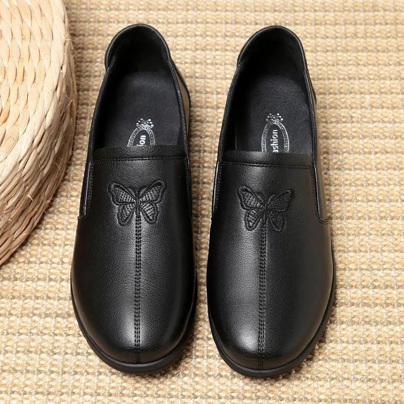 Весенние Мягкие На Новой Подошве Мамины Черные Одинарные Туфли Кожаные Нескользящие Повседневные Удобные Туфли на Плоской Подошве для Дам Среднего Возраста Женская Обувь