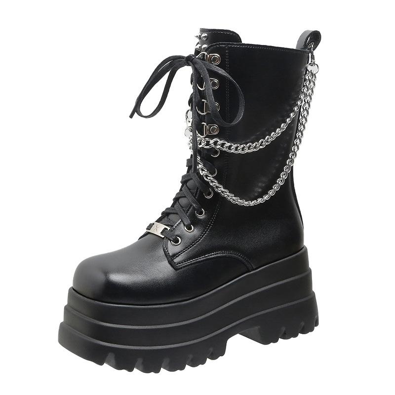 Women'S 9Cm Gothic Platform Chelsea Boots Mid Calf Leather Boots British Style Chunky Heel Solid Color Size 35-42 Wide Fit Shoes