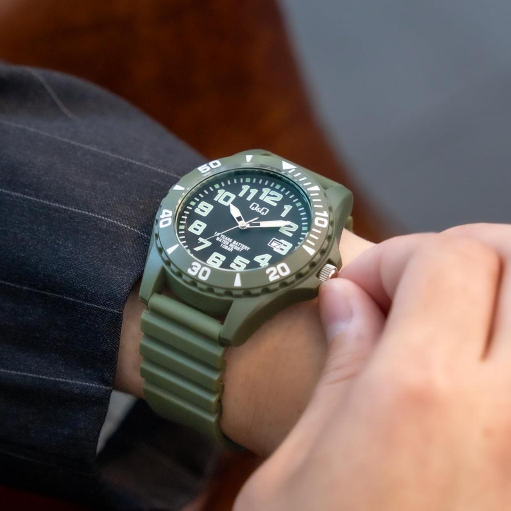 Citizen Аналоговые Батарейка 10 АТМ Водонепроницаемые Дата Уретановая модель Мужские часы Q&Q, Хаки, 10-летний срок службы, Устойчивость, Дисплей, Ремешок, A22A-003VK
