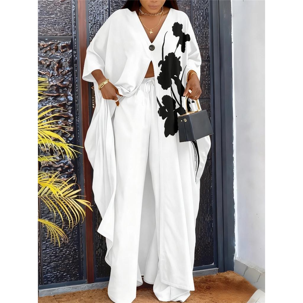 Женский комплект рукав три четверти V-образный вырез пуговицы принт халат брюки на кулиске — купить товар онлайн с бесплатной доставкой по всему миру!