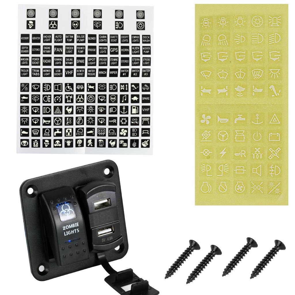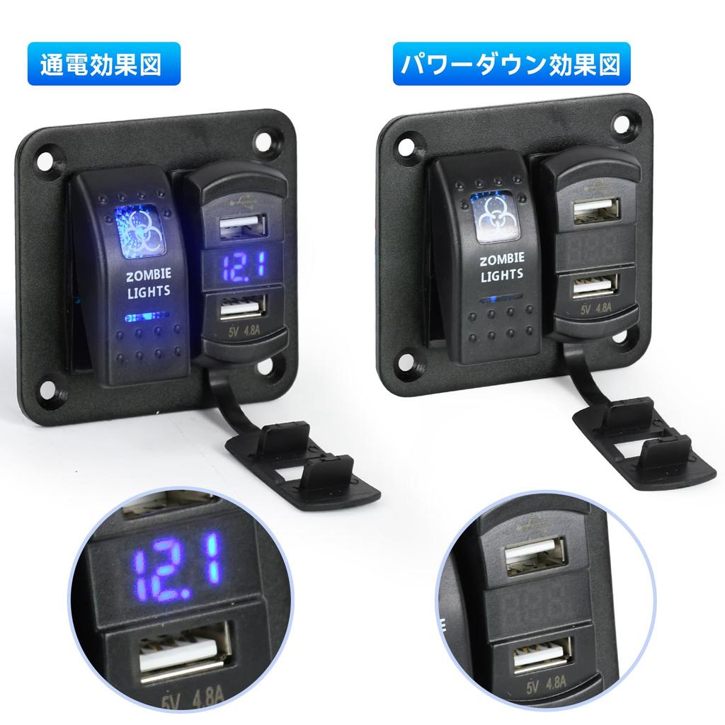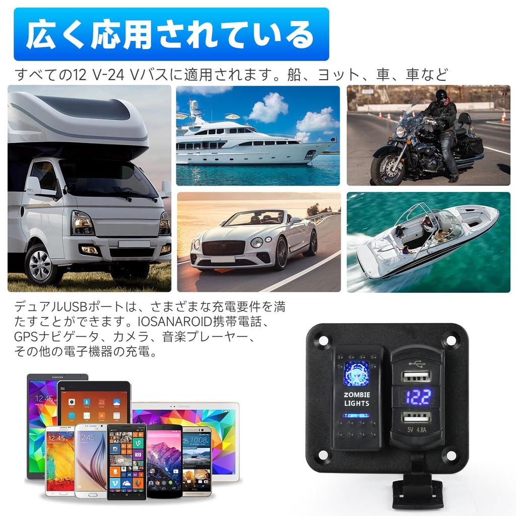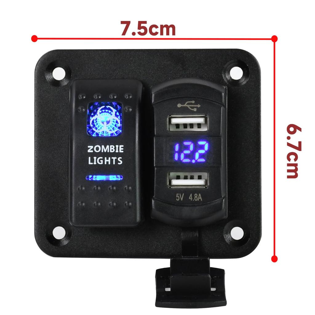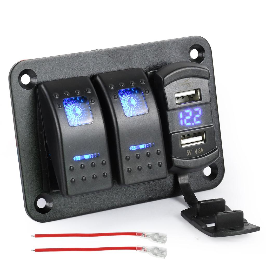 【Многофункциональная панель】Двойные USB-порты (2,4 А + 2,4 А), цифровой дисплей напряжения, синий светодиодный индикатор, водонепроницаемая плата, разъем питания постоянного тока, встроенный выключатель для удовлетворения ваших различных потребностей, таких как зарядка вашей /24В электрической панели