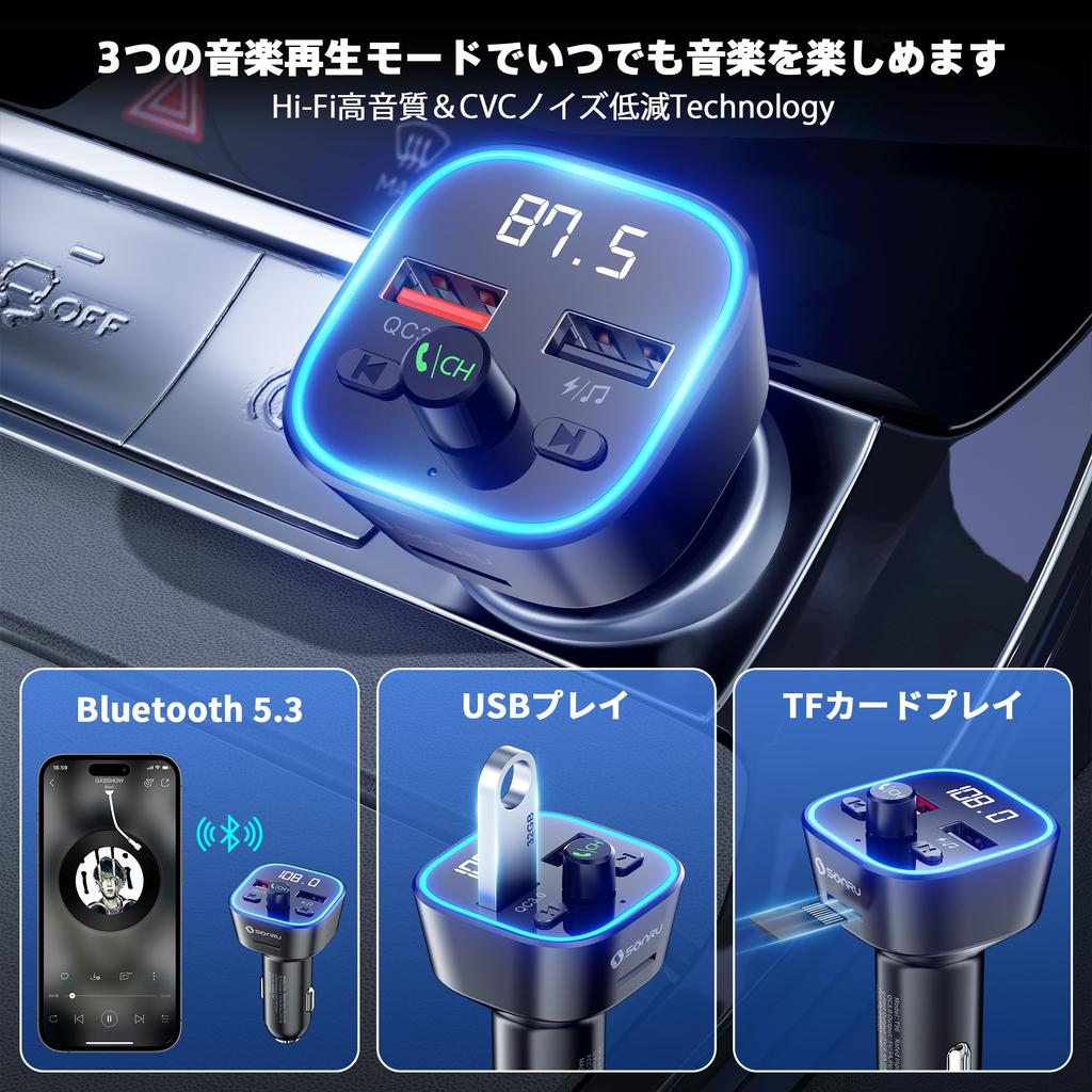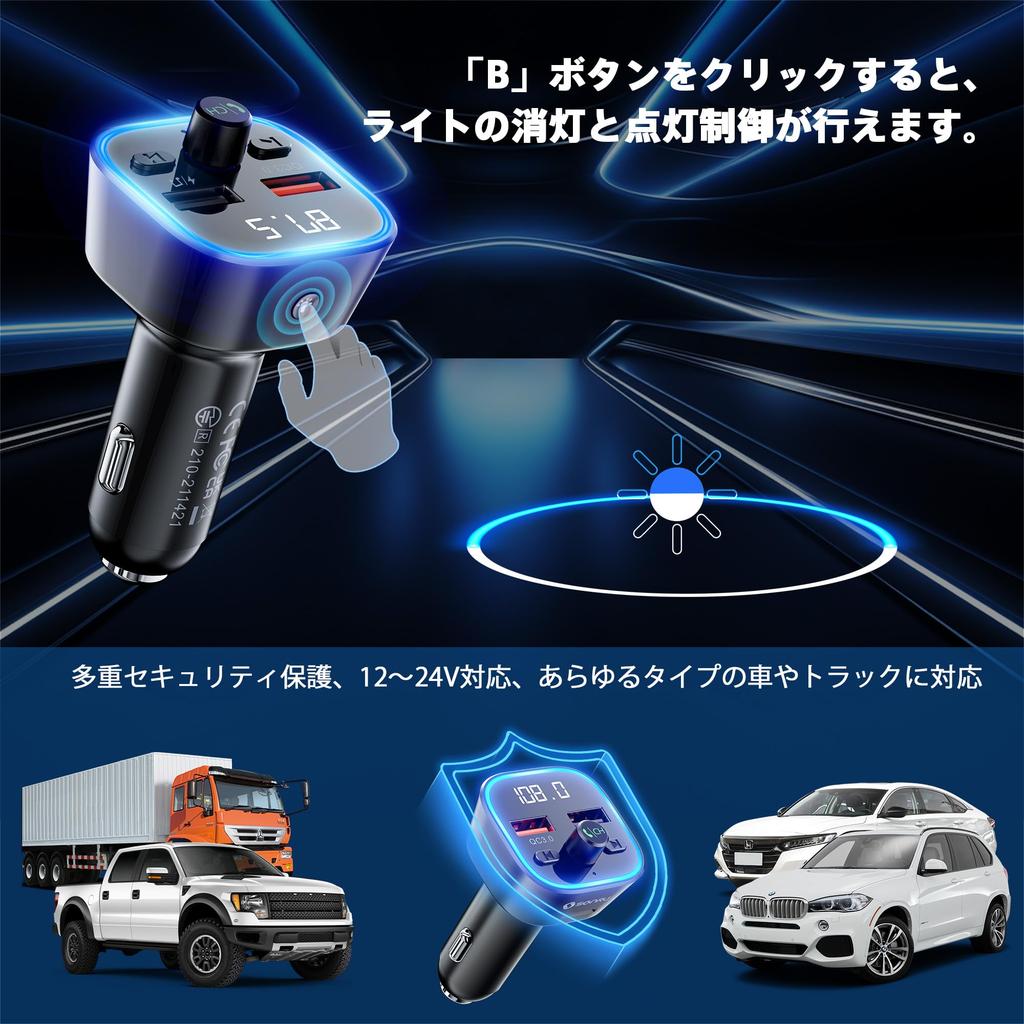 Bluetooth-передатчик, FM 5.3 Автомобильный передатчик, Быстрая зарядка, Автомобильное зарядное устройство, Громкая связь, Поддержка Bluetooth/USB-накопителя,