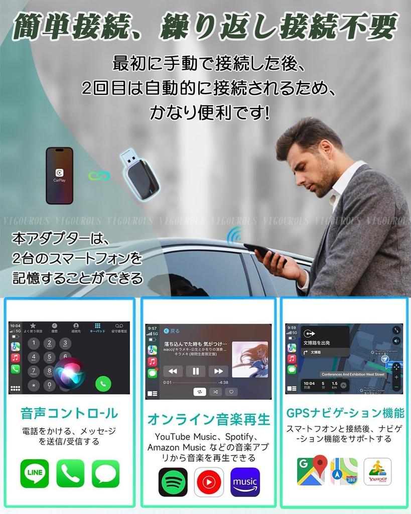 Загружен удобными функциями, полностью интегрирован с работой автомобиля: Навигация, карты, звонки, сообщения, LINE, музыка и т. д., все по беспроводной связи на большом автомобильном экране. Работает со всем программным обеспечением, поддерживаемым CarPlay или Android Auto. Он также поддерживает голосовое управление, поддерживает «Привет, Siri» или «ОК, Google», и вы можете использовать различные функции с помощью голосового управления. Синхронное управление ручкой, сенсорным экраном, рулевым управлением и т. д.. Автомобильный беспроводной адаптер полностью удовлетворяет все ваши потребности в вождении