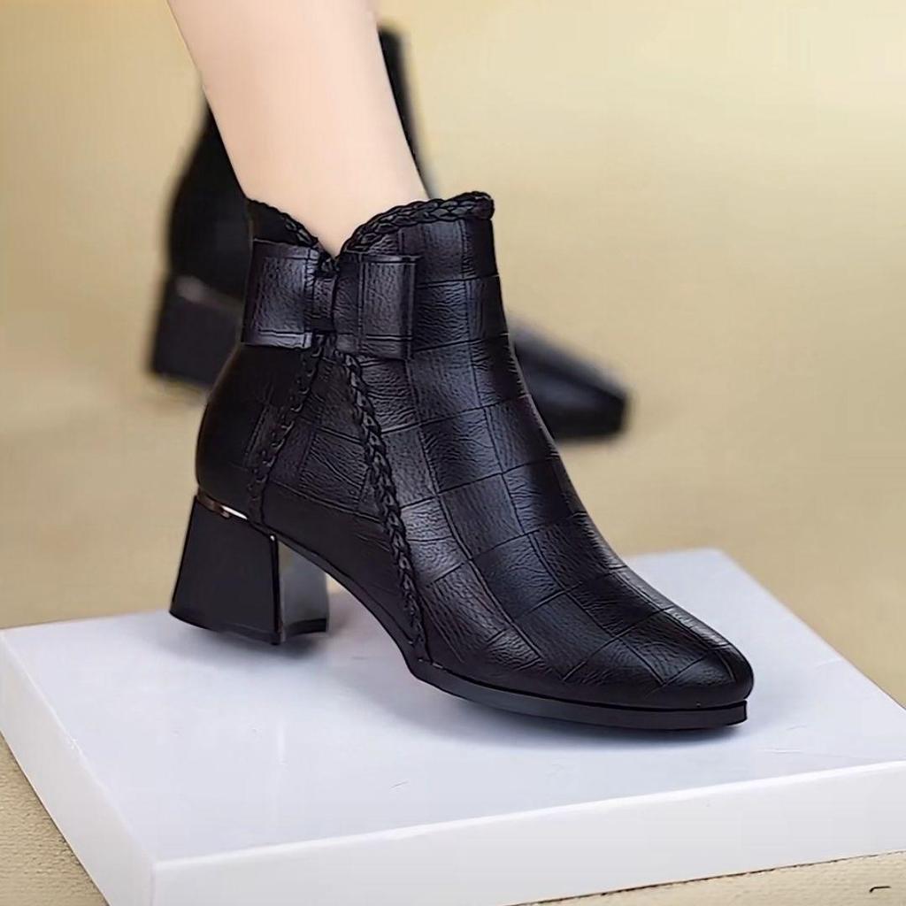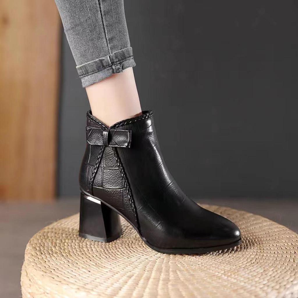 Женские ботильоны из натуральной кожи с острым носком и бантом - осенне-зимний стиль, с плюшевой подкладкой, до середины икры, темпераментные ботинки Мартин.