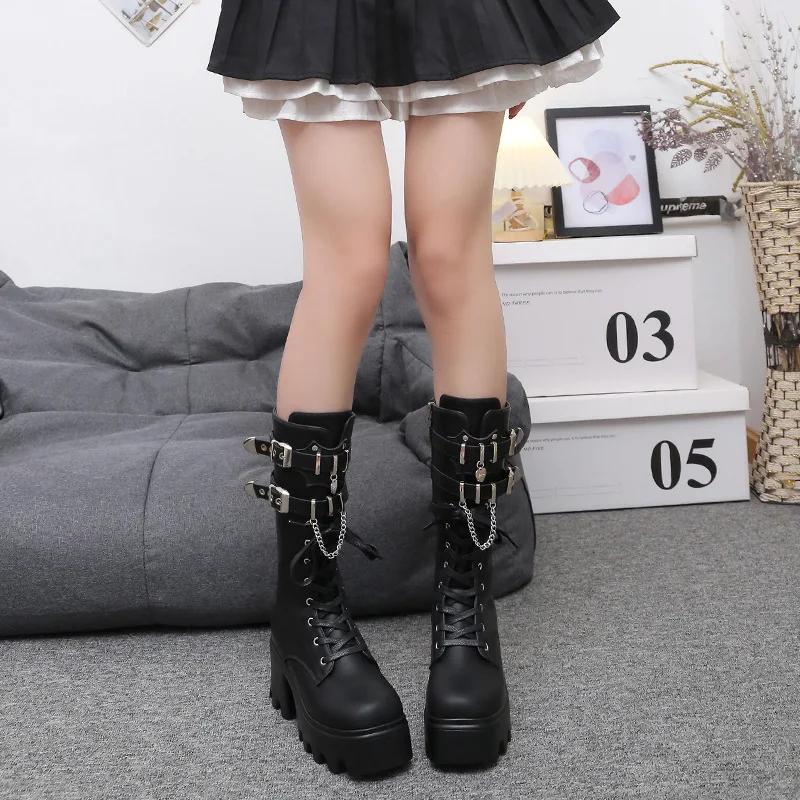 Модные женские панк-готические ботинки 2025 Модные ботинки до середины икры на высоком каблуке с цепочкой и пряжкой Женские черные ботинки из искусственной кожи больших размеров 42 Осенние ботинки