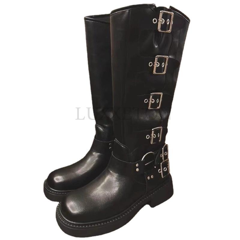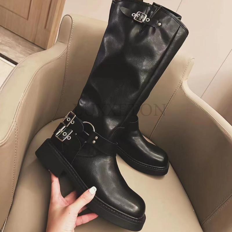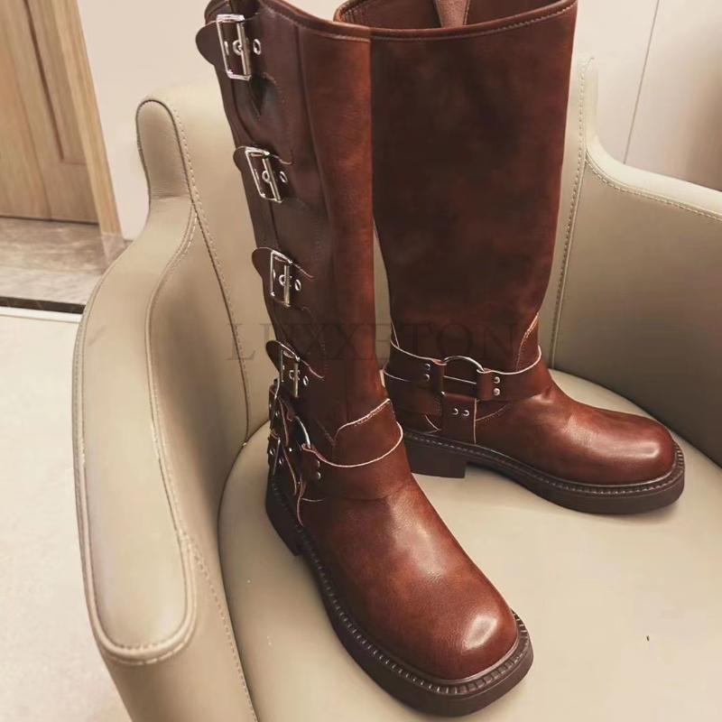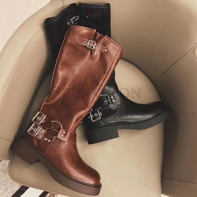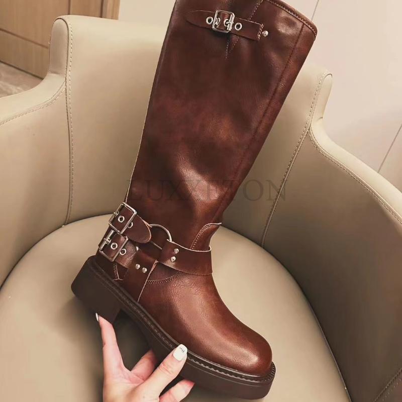 Винтажные коричневые и черные женские рыцарские сапоги на блочном каблуке с металлическим ремешком и пряжкой на платформе большого размера в стиле ретро для женщин