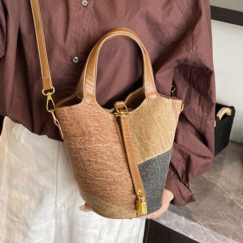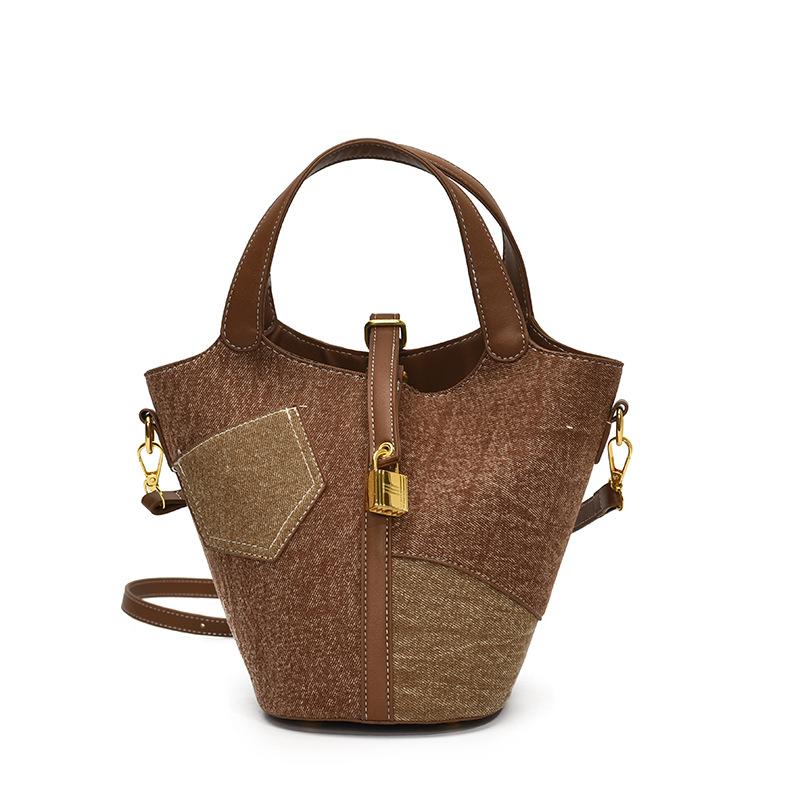 2025 new Korean version of literary personality splicing denim portable bucket bag fashionable versatile commuter messenger bag