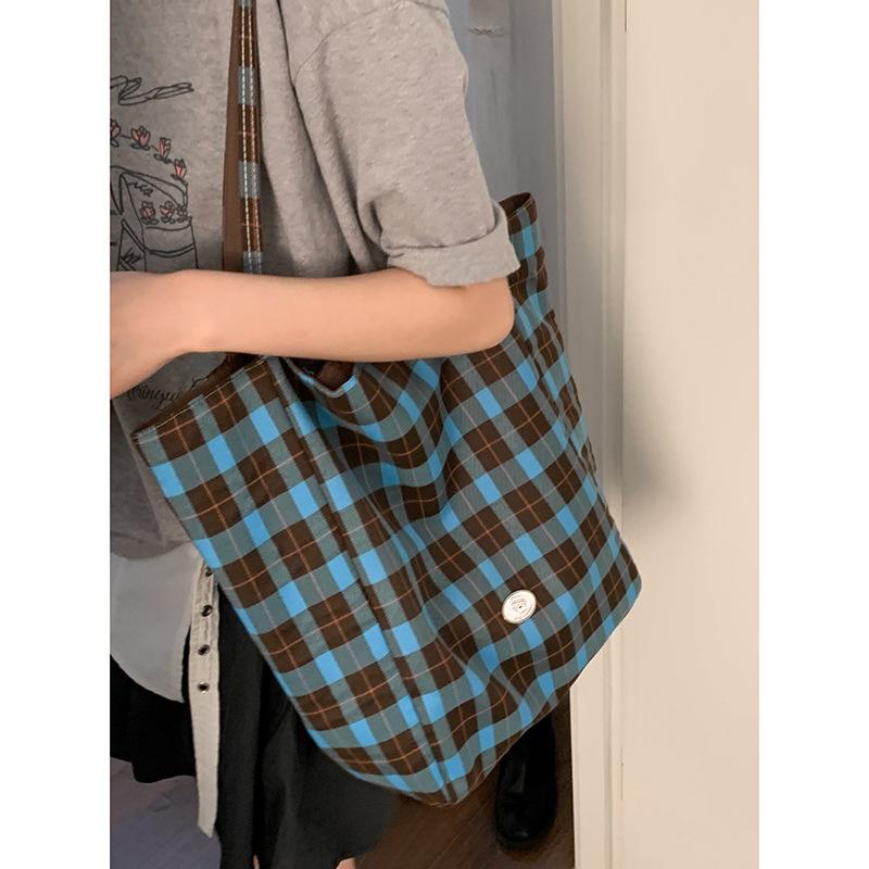Повседневная двусторонняя холщовая сумка в корейском ленивом стиле, сумка под мышкой, женская новая сумка-тоут в клетку большой вместимости 2025 года
