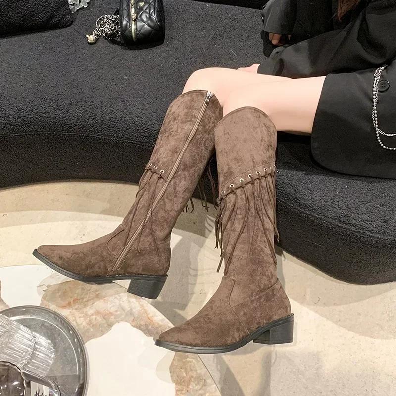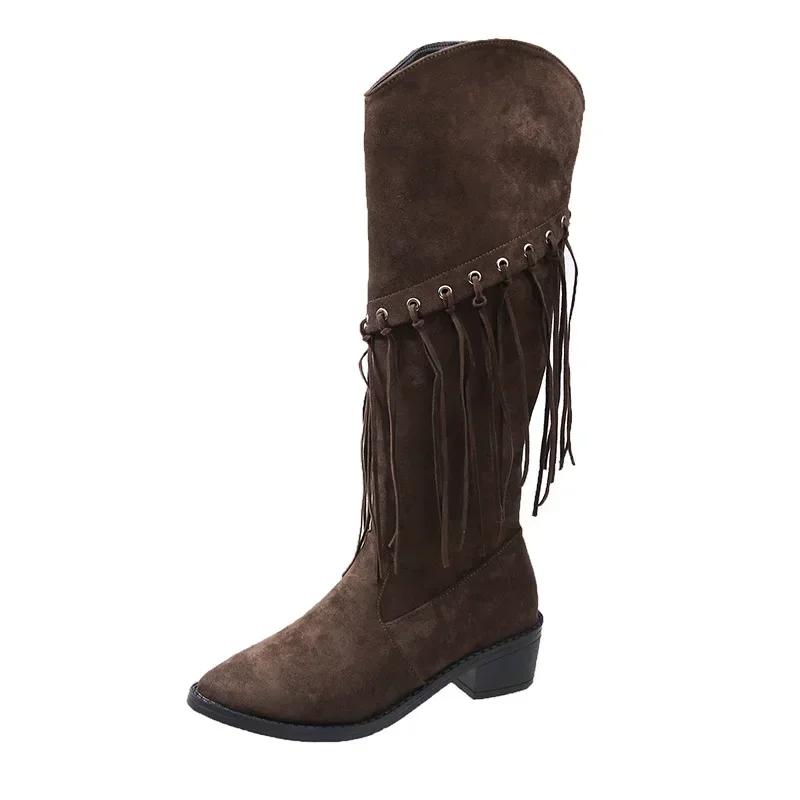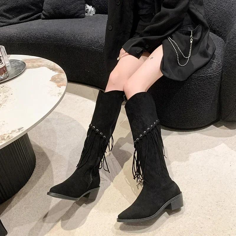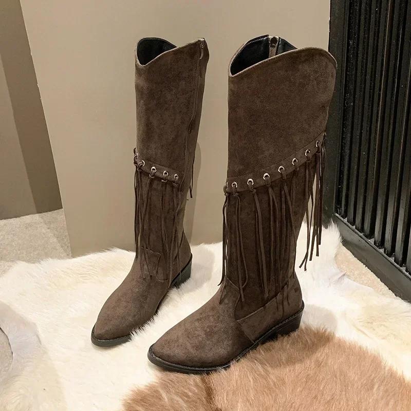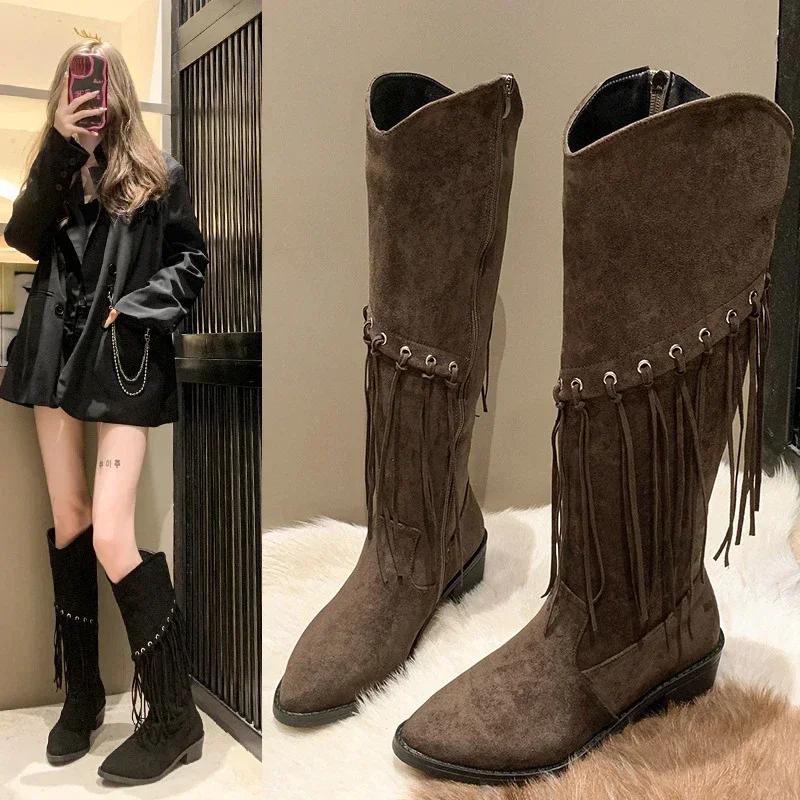 Модные женские сапоги длиной до колена в стиле бохо, новые заостренные сапоги из искусственной замши с кисточками, женские длинные сапоги на толстом каблуке, женские сапоги 2024 года