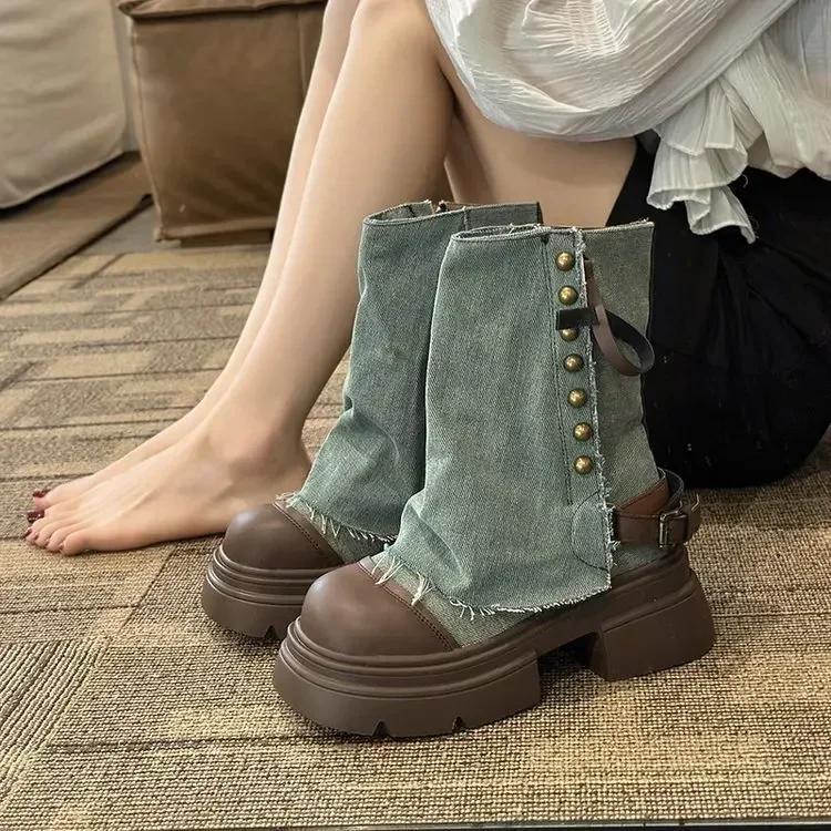 Дизайнерские женские ботильоны, короткие джинсовые ботинки в стиле вестерн, ботильоны с заклепками, модные туфли на толстой платформе 2052