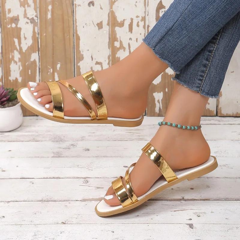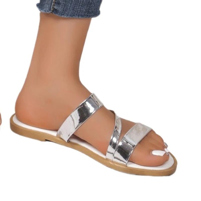 Лето 2024 года, хит продаж, высококачественная женская обувь с открытым носком, однотонные модные блестящие женские пляжные тапочки на плоской подошве
