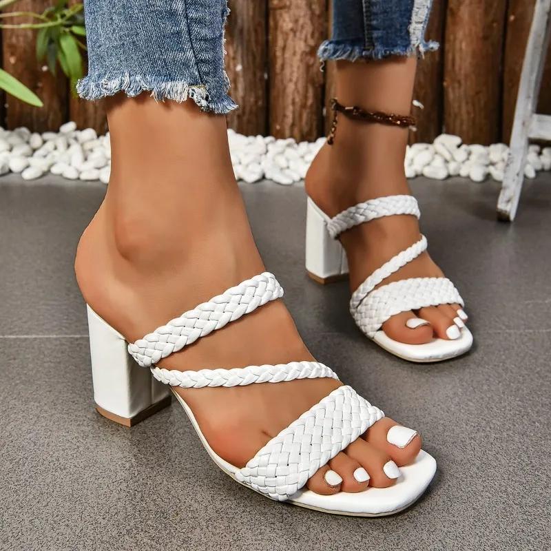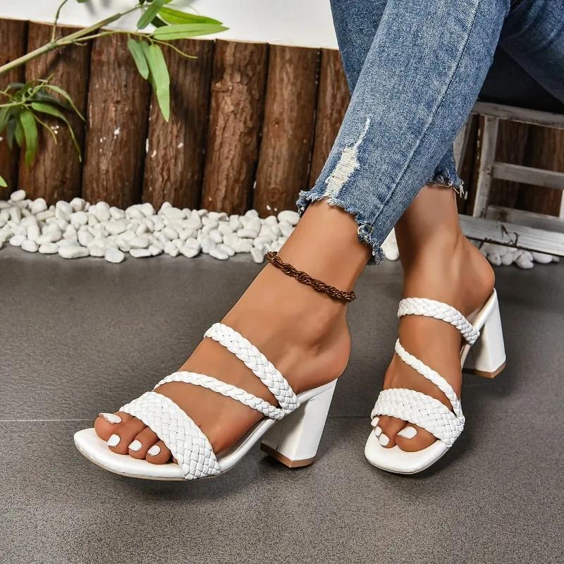 2024 Модные однотонные летние женские тапочки с открытым носком на высоком каблуке с тонким ремешком, толстый каблук, удобные и универсальные
