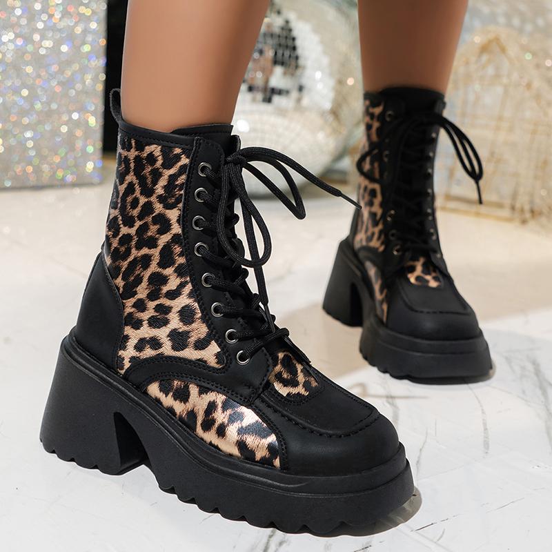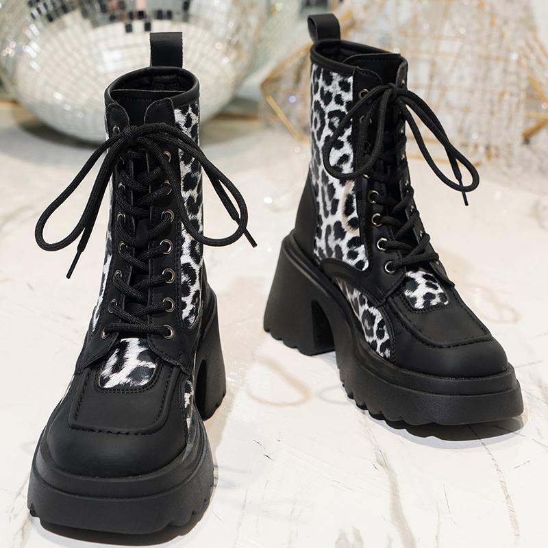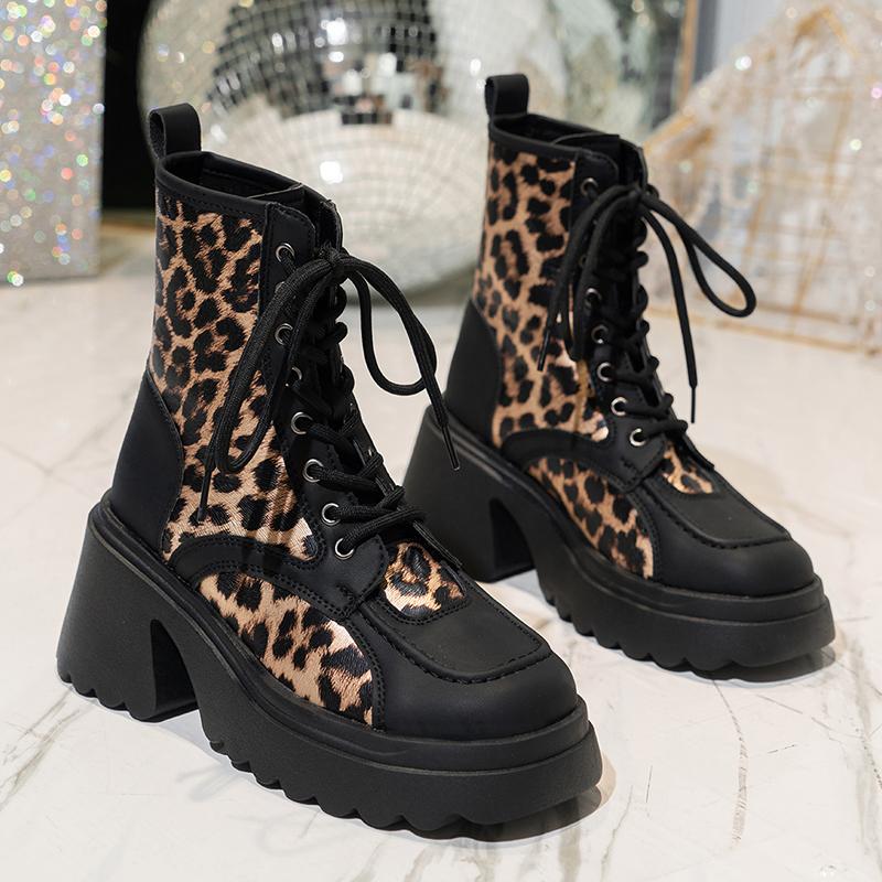 Ботильоны на толстой платформе с леопардовым принтом для женщин, на шнуровке, на высоком каблуке, мотоциклетные ботинки, женские, в стиле панк, из искусственной кожи, короткие ботильоны 42