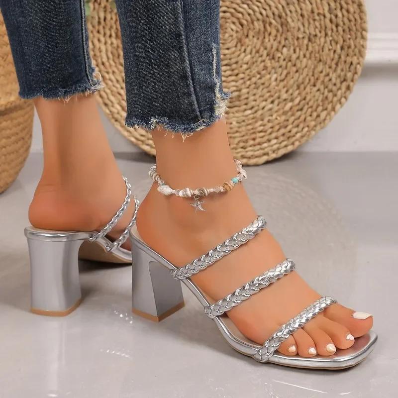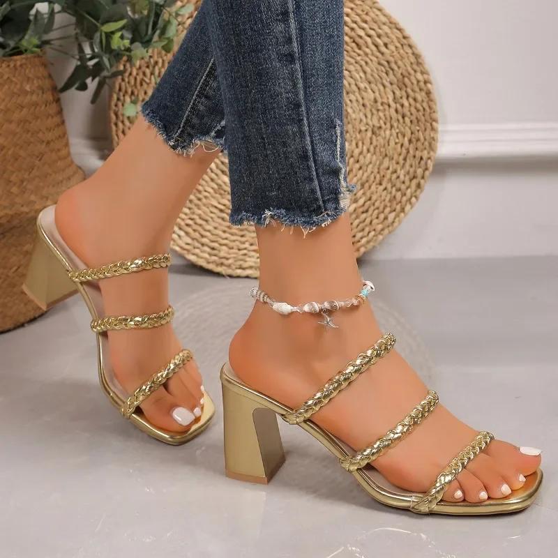 2024 Новые популярные удобные однотонные декоративные толстые каблуки удобные и универсальные пляжные плетеные женские туфли