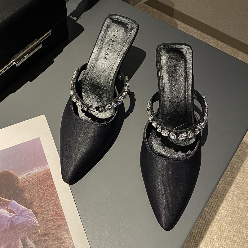 Летние туфли на каблуке с острым носком для женщин 2024 года, сексуальные женские мюли с закрытым носком, со стразами, офисные женские повседневные туфли-лодочки на шпильке
