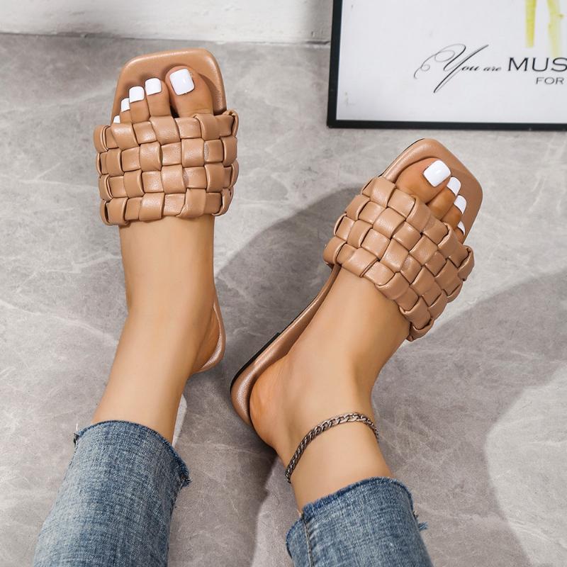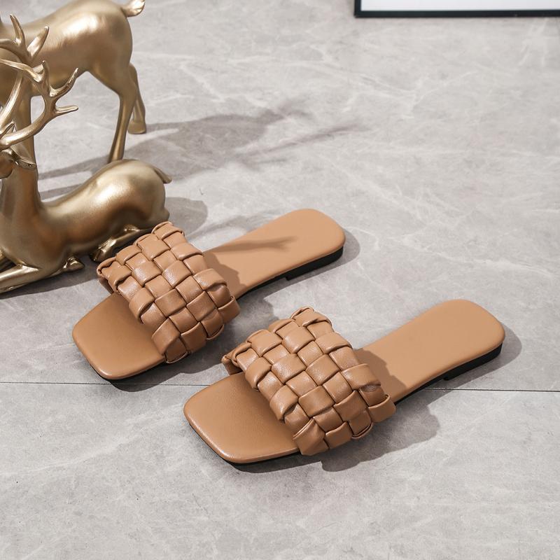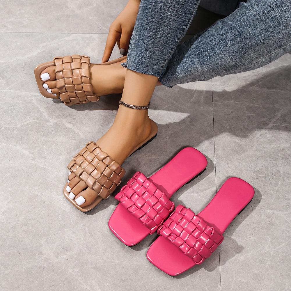 2024 Новые плетеные мягкие уличные тапочки для женщин с квадратным носком плоские сандалии женские большие размеры летние пляжные шлепанцы женские