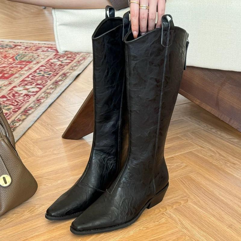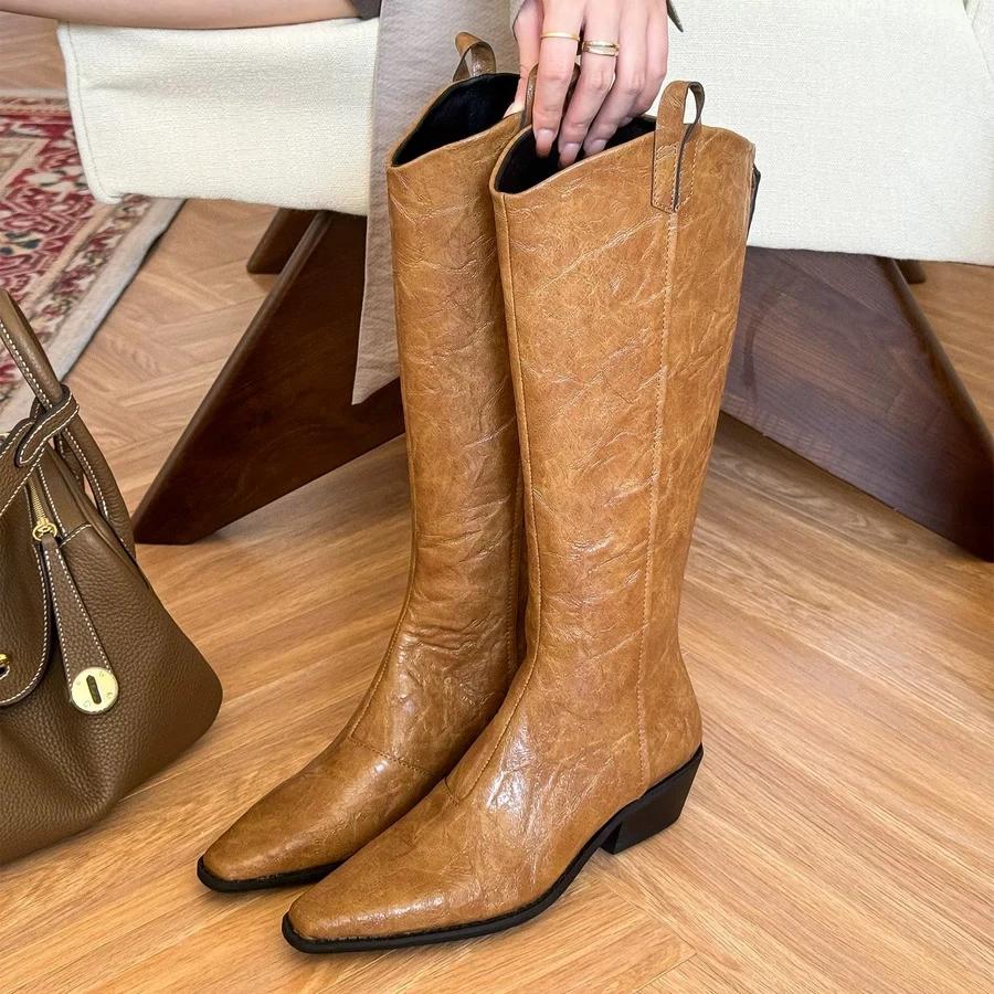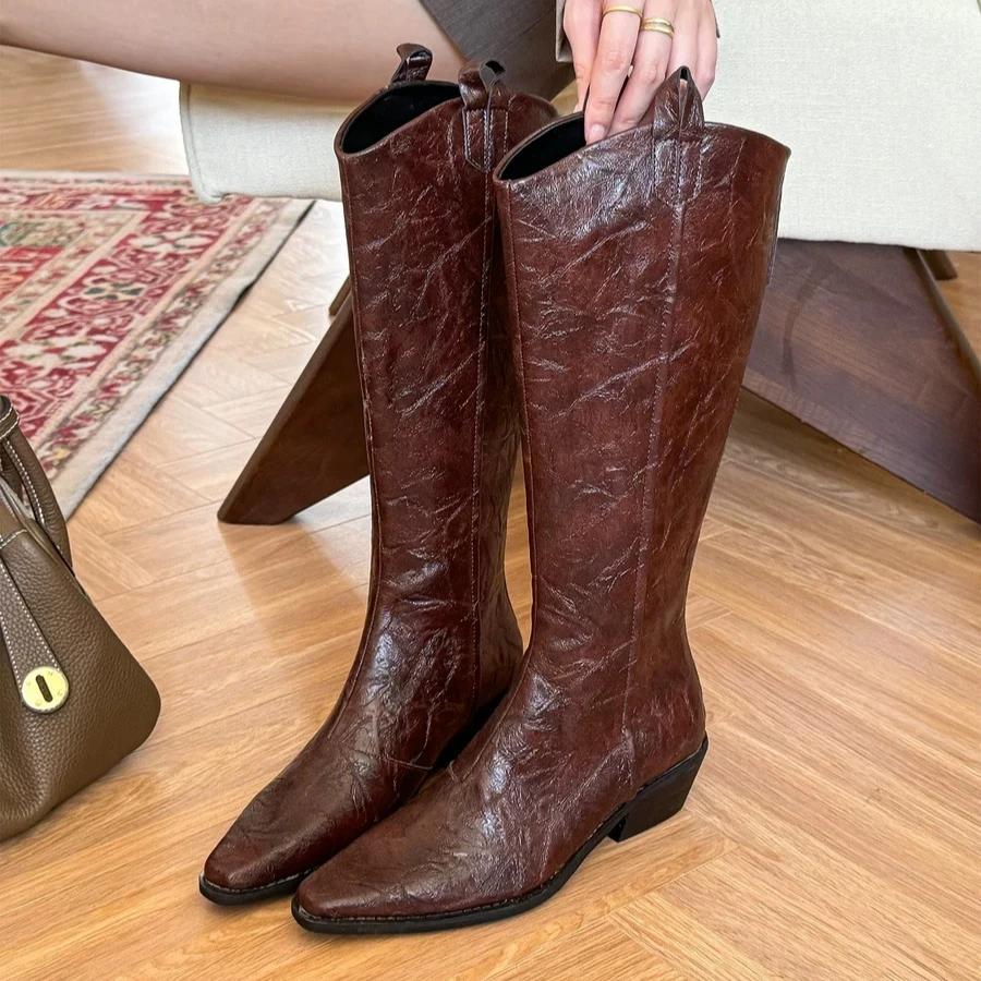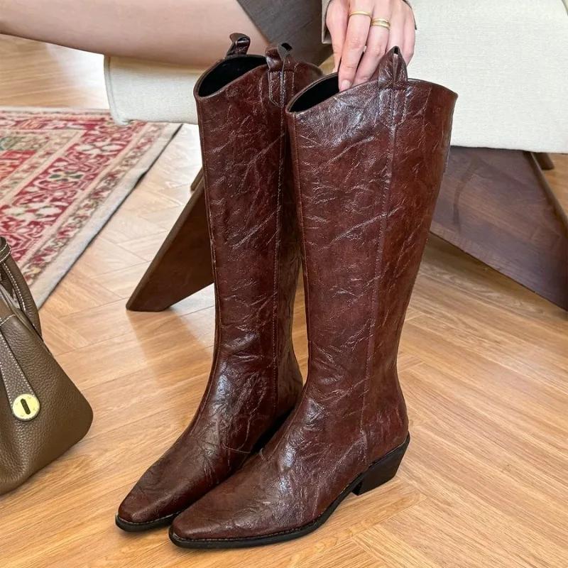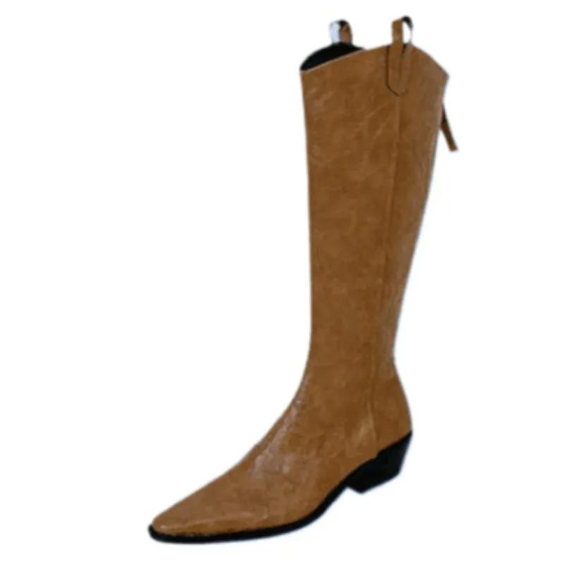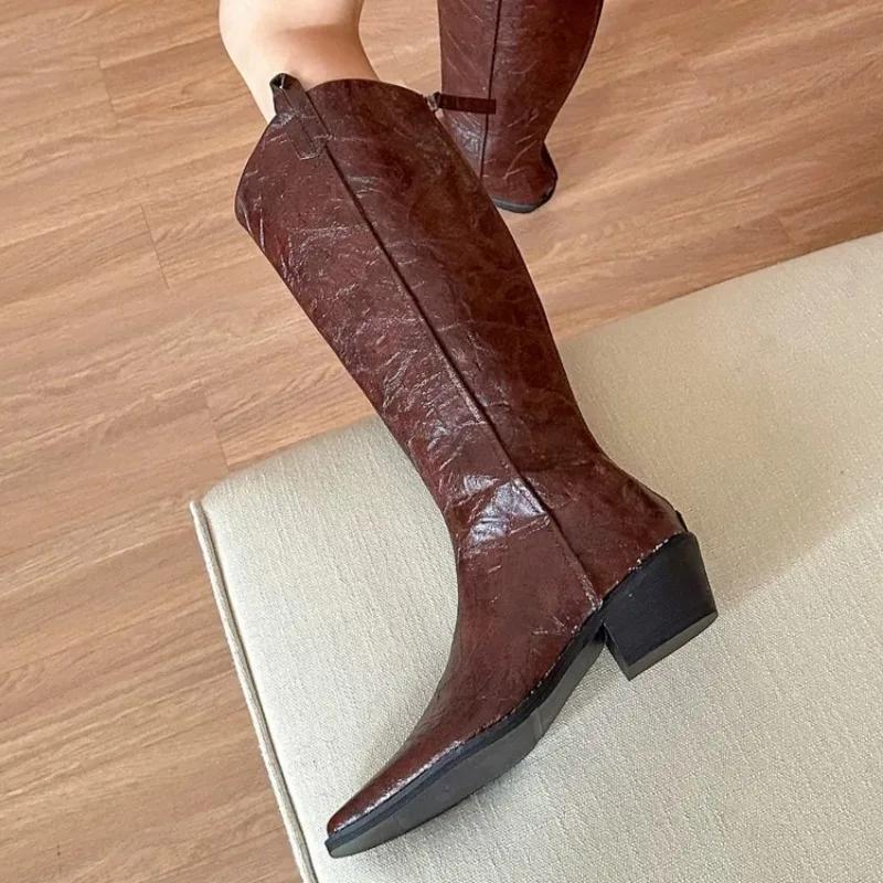 Женские сапоги до колена, брендовые модные кожаные туфли с острым носком и средним каблуком, зимняя трендовая обувь 2025 года в готическом стиле, туфли-лодочки Chelsea Party Botas Mujer