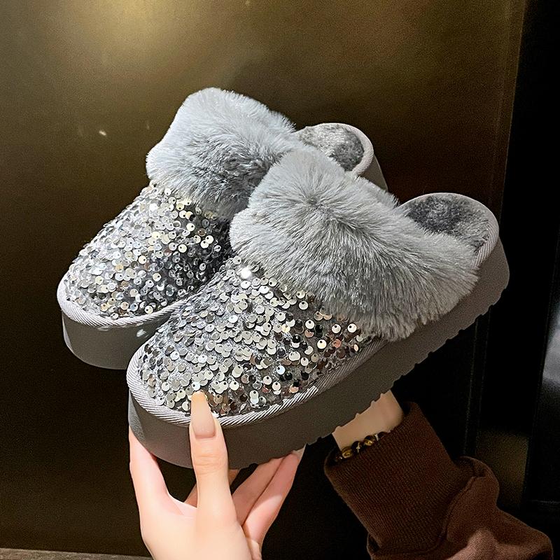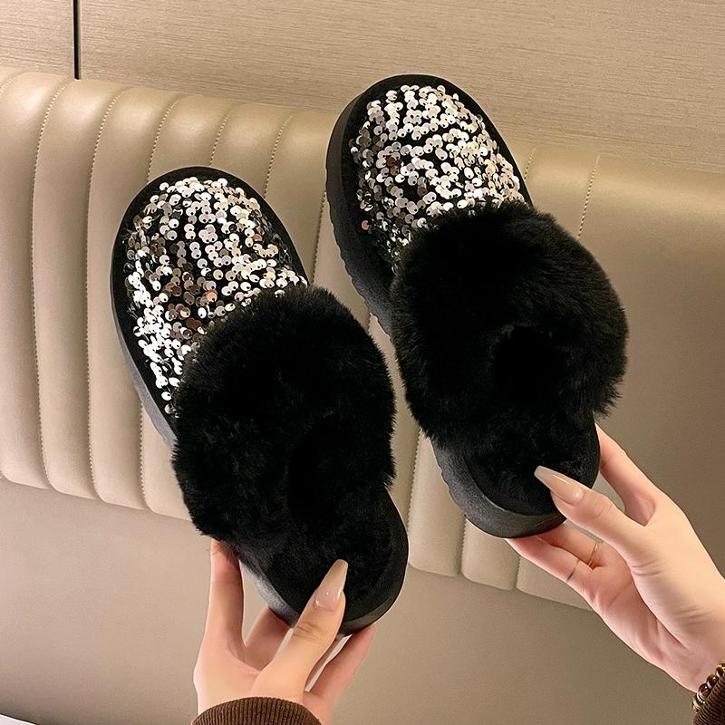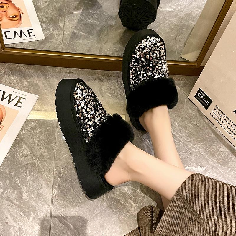 Женские тапочки на платформе с пайетками, домашние туфли на плоской подошве из хлопка, зимняя мода 2025 года, короткие плюшевые теплые шлепанцы с открытой пяткой, Zapatillas Mujer