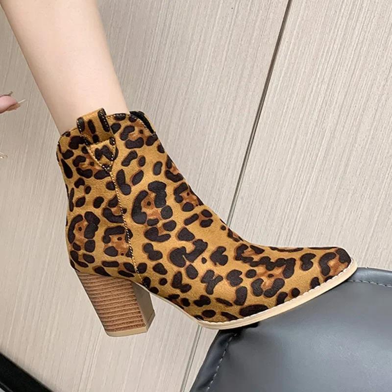 Новые сексуальные женские леопардовые сапоги из флокированной кожи с острым носком на высоком каблуке, ботильоны с боковой молнией, осенние женские сапоги