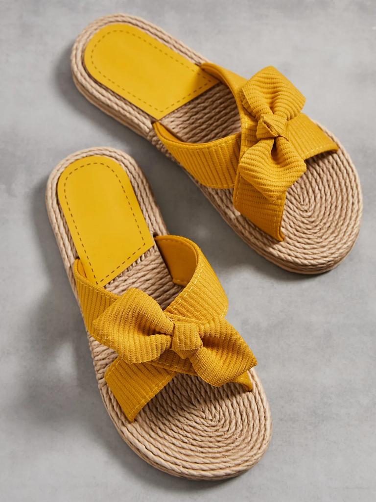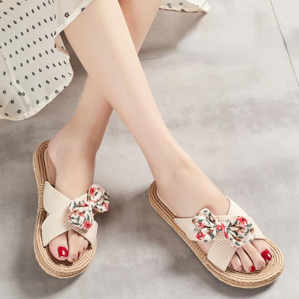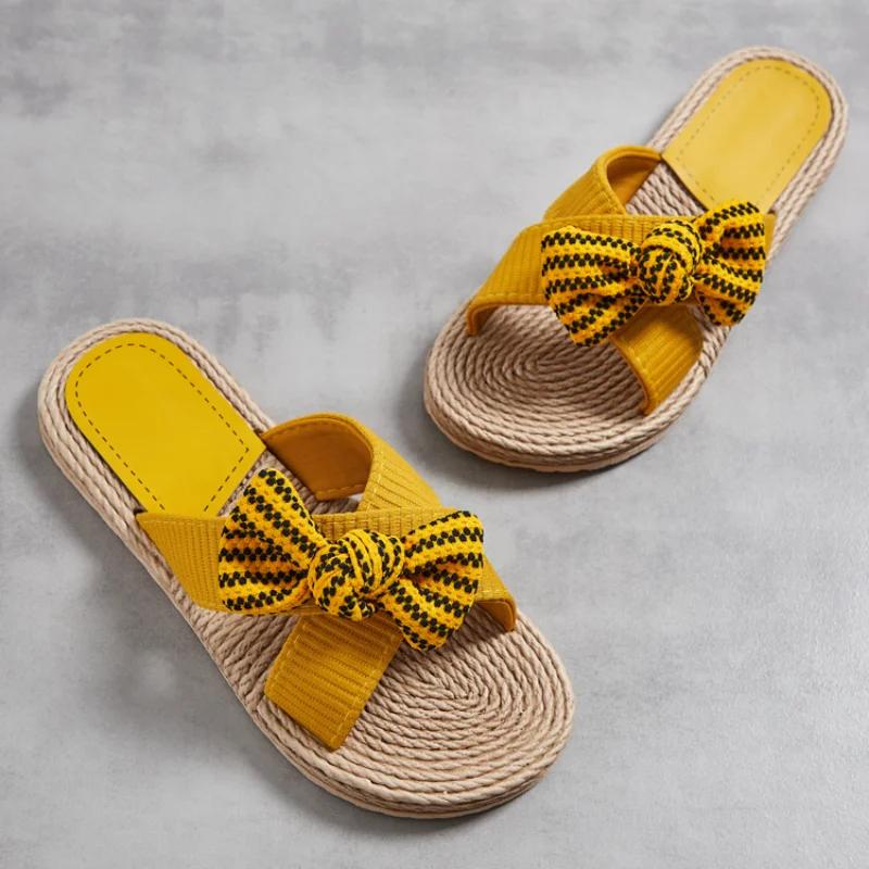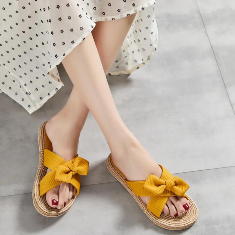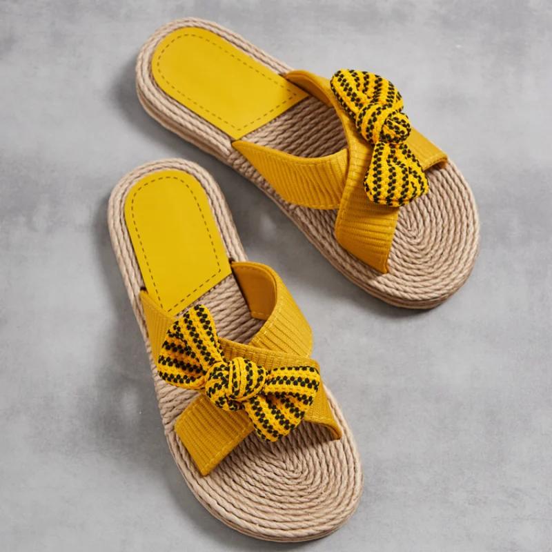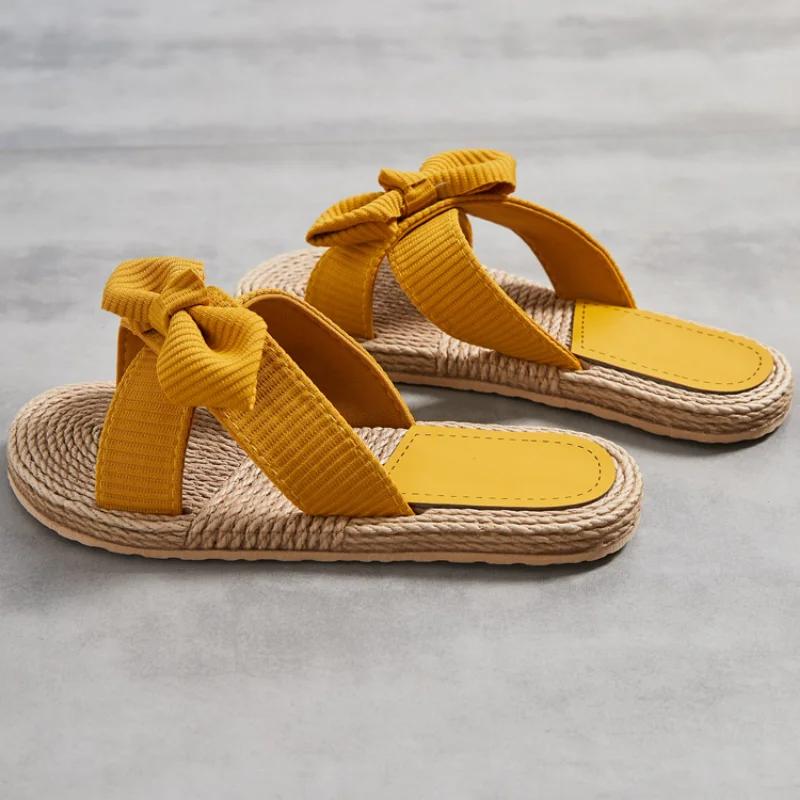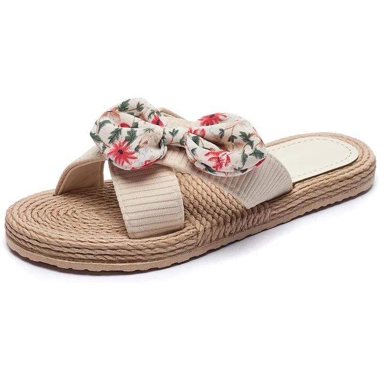Новые летние женские тапочки ручной работы, сплошной цвет с подошвой из пеньковой веревки, модные тенденции, домашние и уличные тапочки с бежевым цветком и бантом, обувь