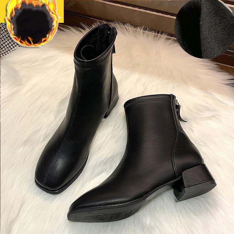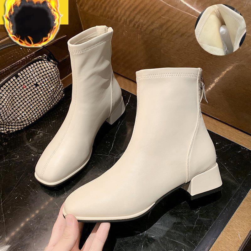 2024 Новые модные весенне-осенние женские сапоги на толстом каблуке с квадратным носком, тонкие белые короткие сапоги, короткие флисовые сапоги