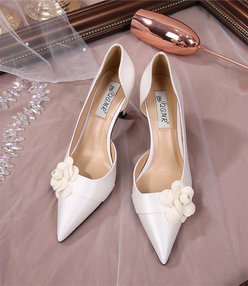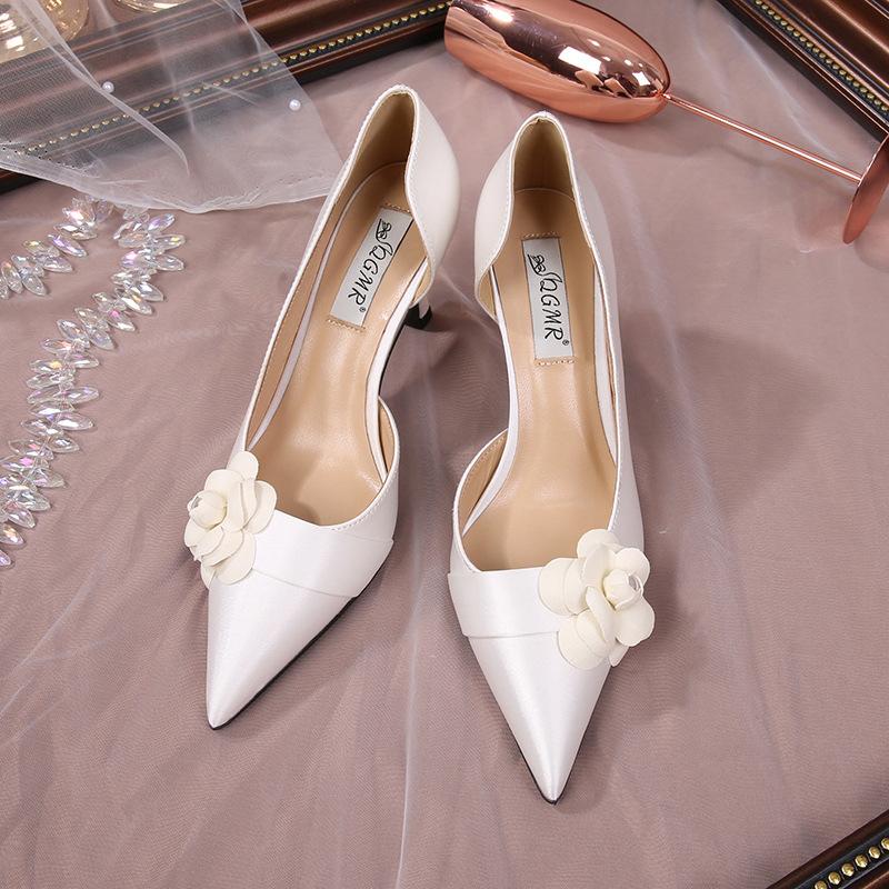 Французские камелии белые атласные туфли на каблуках женские тонкие каблуки 2024 новые простые универсальные туфли для банкета с острым носком осеннее время