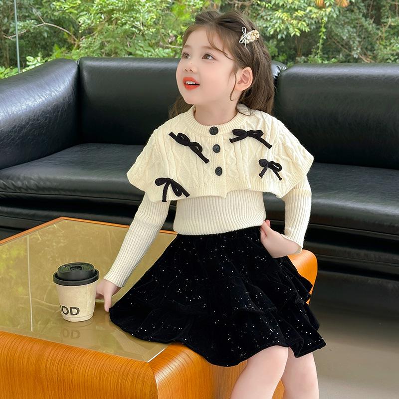 Окунитесь в уютное очарование сезона с этим восхитительным осенне-зимним комплектом для девочек. Он представляет собой красиво связанный кардиган с длинными рукавами, идеально подходящий для того, чтобы согреться в прохладные дни.. В комплекте с роскошной бархатной юбкой, этот набор излучает элегантность и стиль.. Дополняет образ милая накидка с бантом, которая добавляет нотку причудливой изюминки.. Этот ансамбль, изготовленный из высококачественного трикотажного материала, обеспечивает как комфорт, так и модную привлекательность для любой юной законодательницы моды.