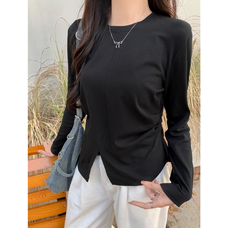 Осенняя новая футболка с длинным рукавом и разрезами по бокам, женская облегающая базовая футболка, черный топ