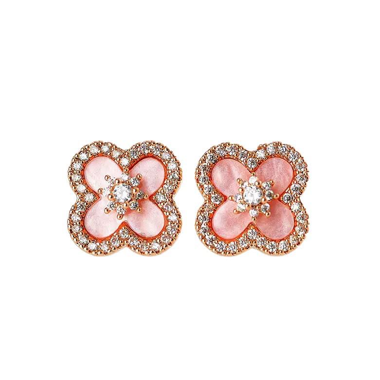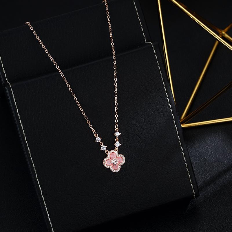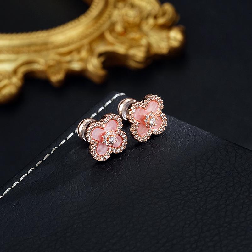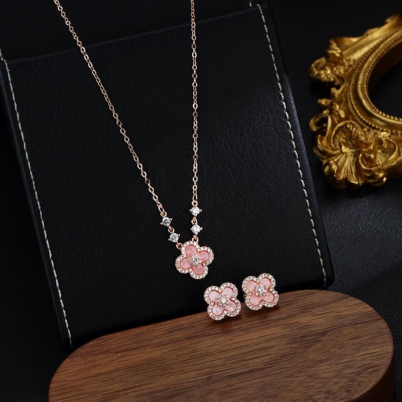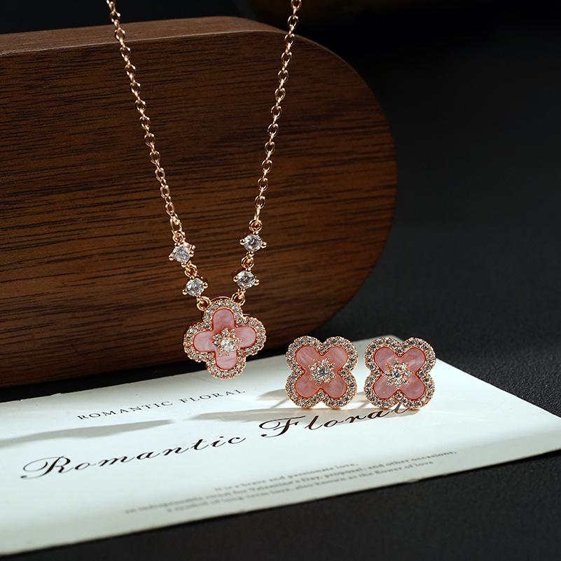 Серьги-пусеты в виде четырехлистного клевера ярко-розового цвета и набор из позолоченного ожерелья для женщин