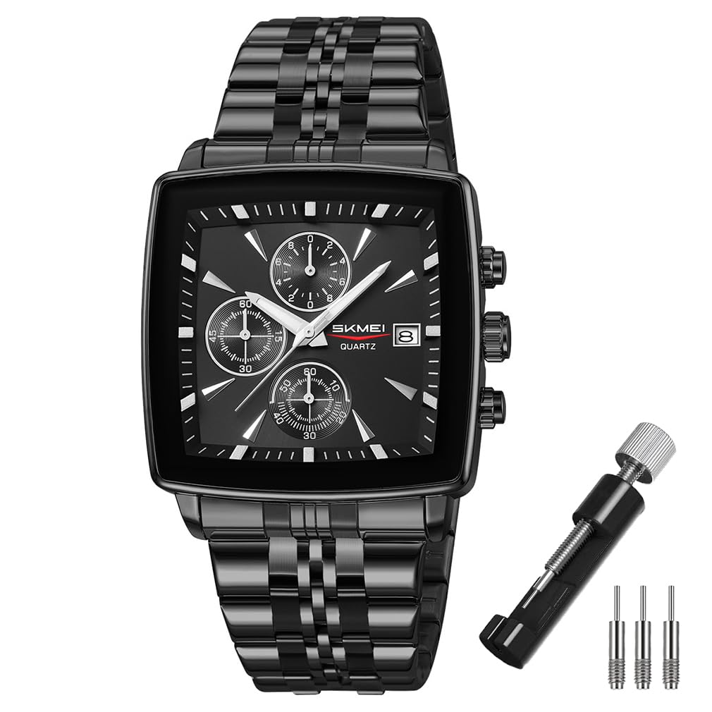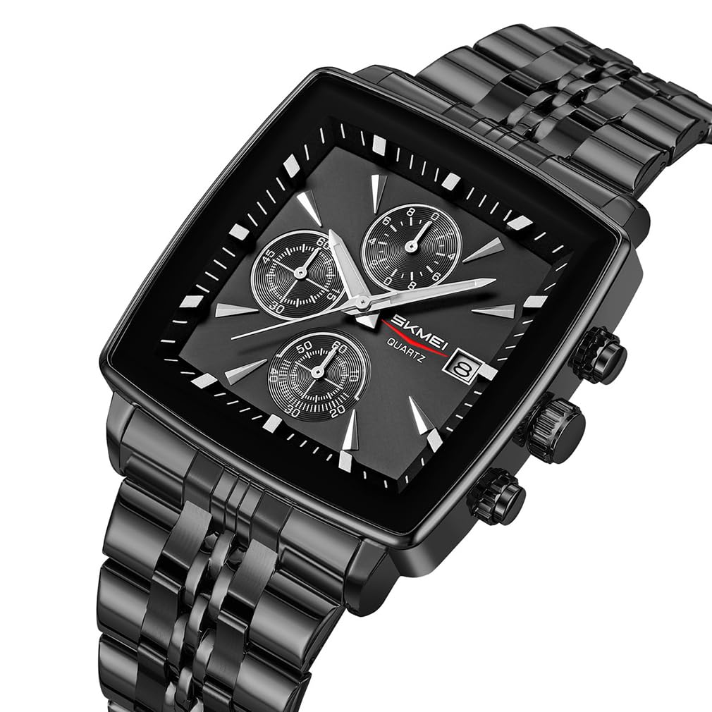 Мужские квадратные часы SKMEI со стильным металлическим браслетом предлагают повседневный, высококлассный аналоговый стиль для бизнеса, заслуживая похвалу и популярность среди многих покупателей.. Эти роскошные мужские часы отличаются стильными деловыми часами из нержавеющей стали с серебристым ремешком и модным полированным скошенным круглым корпусом для удобного ношения.. Эти водонепроницаемые мужские часы из нержавеющей стали золотого и серебристого цвета оснащены высококачественным циферблатным стеклом с антибликовым и прочным покрытием для предотвращения царапин и повреждений.. Эти стильные мужские квадратные часы водонепроницаемы до 30 м, что делает их подходящими для повседневного использования и для мытья рук под дождем.. Не подходит для подводных занятий. уведомление: Не нажимайте кнопки под водой.. Не подходит для купания и плавания.. Эти мужские часы-хронограф с большим циферблатом станут роскошным подарком.. Он оснащен откидной застежкой со скрытой двойной кнопочной застежкой.. Браслет регулируется по размеру, и в коробку входит инструмент для браслета для легкой самостоятельной регулировки.. Эти квадратные часы идеально подходят для запястий.