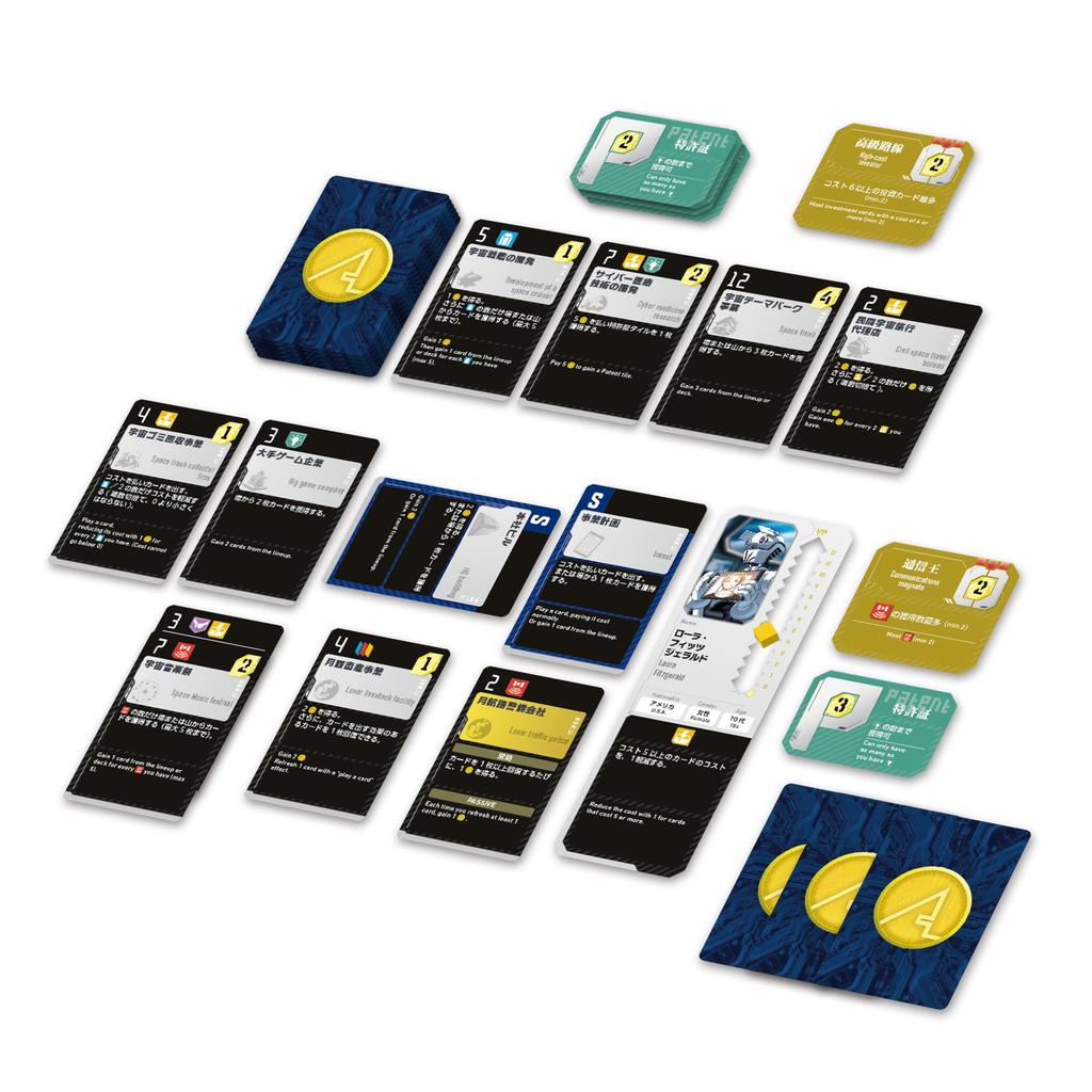 ・Инвестиционные карты: 136 (57 мм x 89 мм) ・Стартовые карты: 8 (57 мм x 89 мм) ・Вступительные карточки: 12 (57 мм x 89 мм) ・Инвесторские советы: 8 ・Патентная плитка: 7 ・Тайлы заголовков: 6 ・Очки Победы: 4 ・Инструкции: 2 (японский/английский)