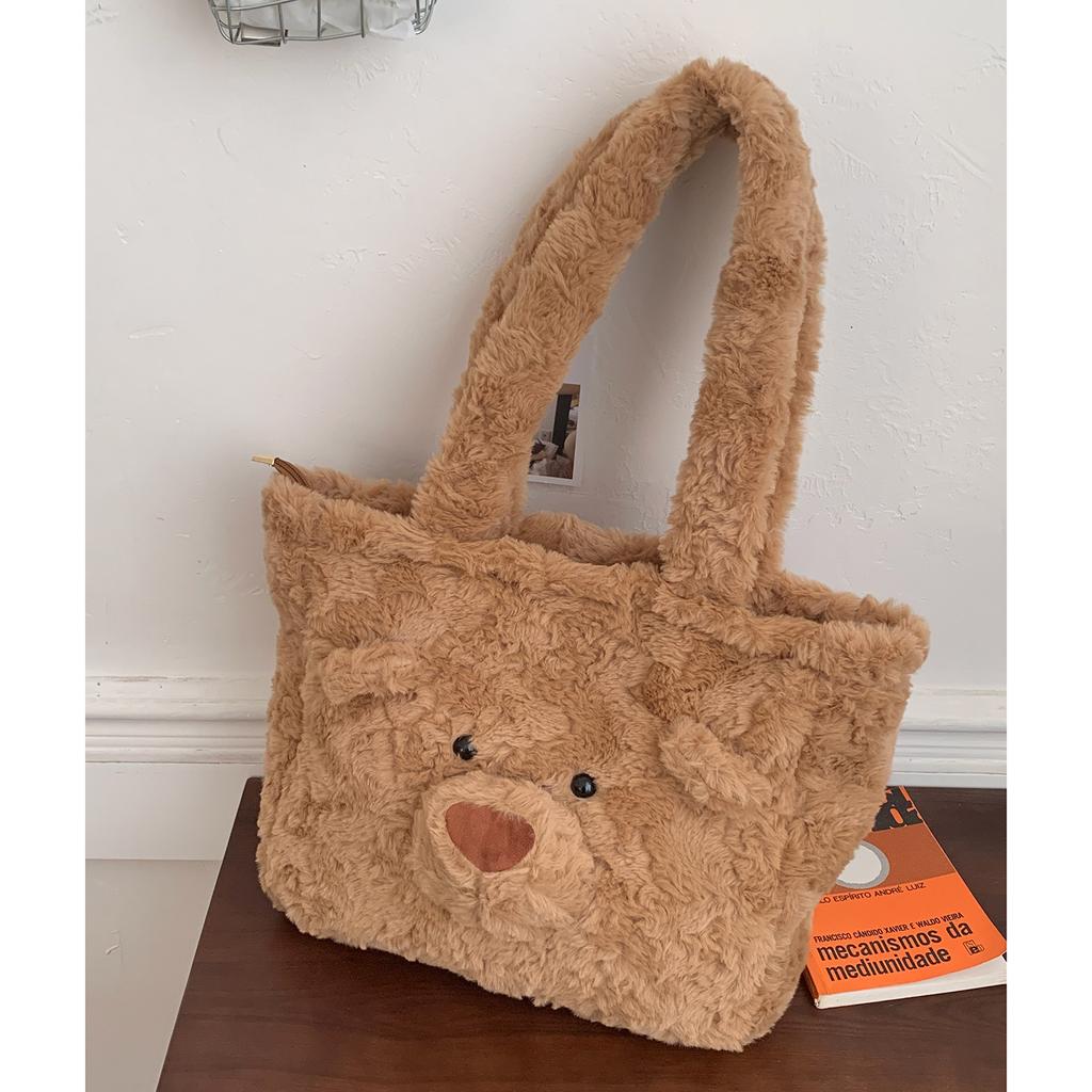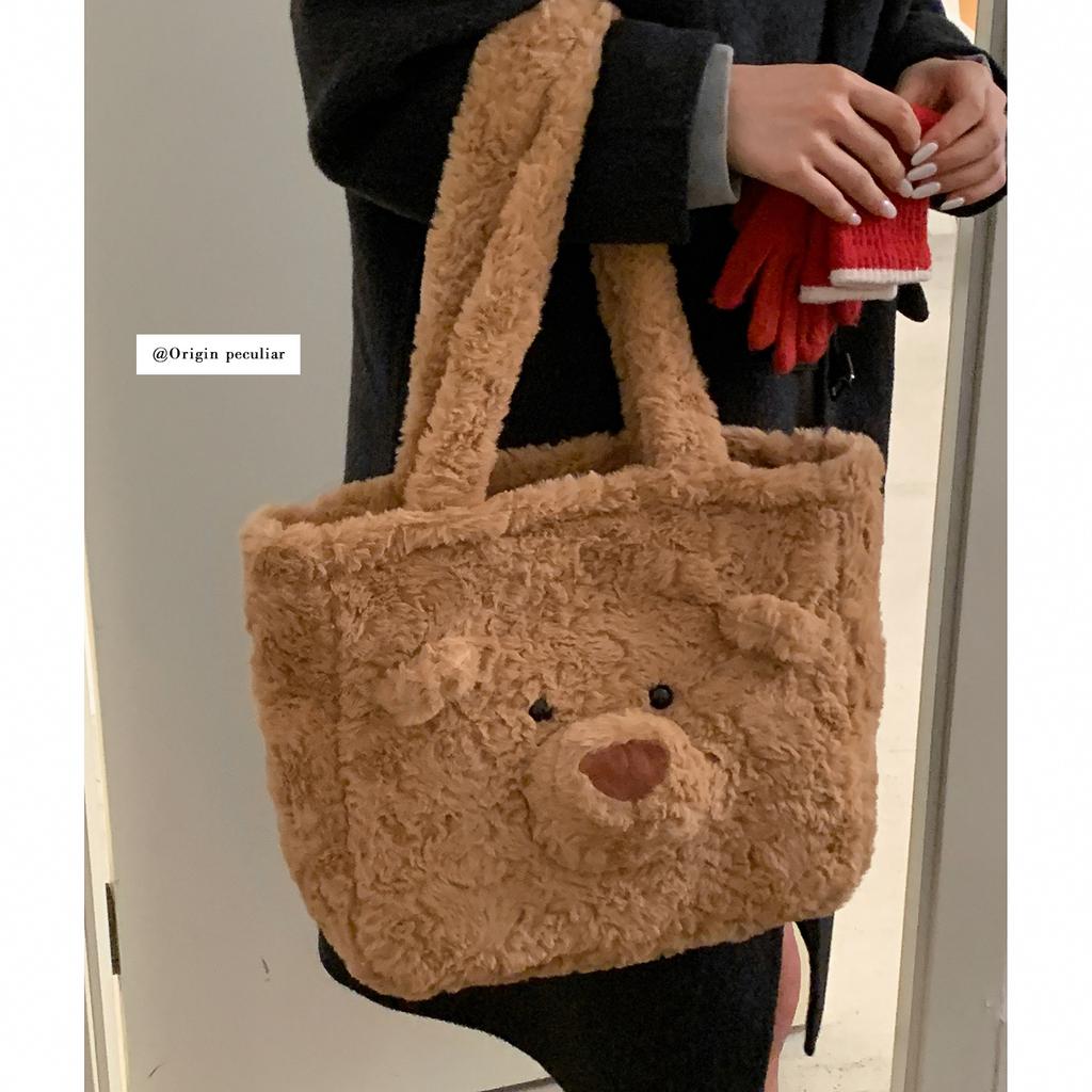 Корейская версия милой плюшевой сумки-мишки 2025 новая большая вместительная наплечная сумка-тоут зимняя модная меховая сумка