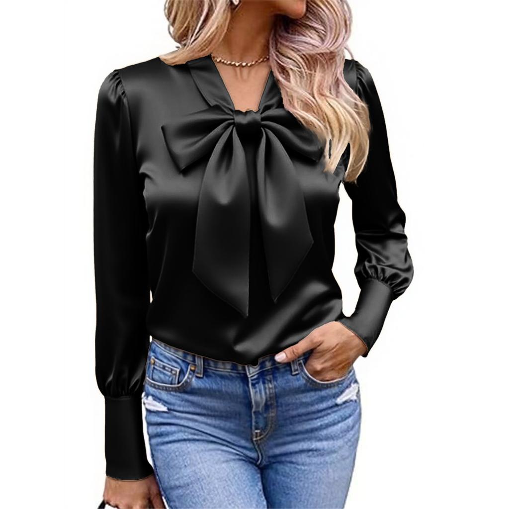 Женская модная однотонная футболка с круглым вырезом, длинными рукавами и бантом, повседневная, универсальная