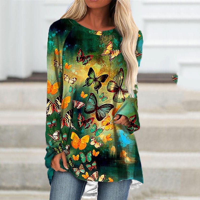Женская футболка больших размеров на весну с принтом бабочек, удобная, с длинным рукавом и круглым вырезом, повседневная, свободная, средней длины