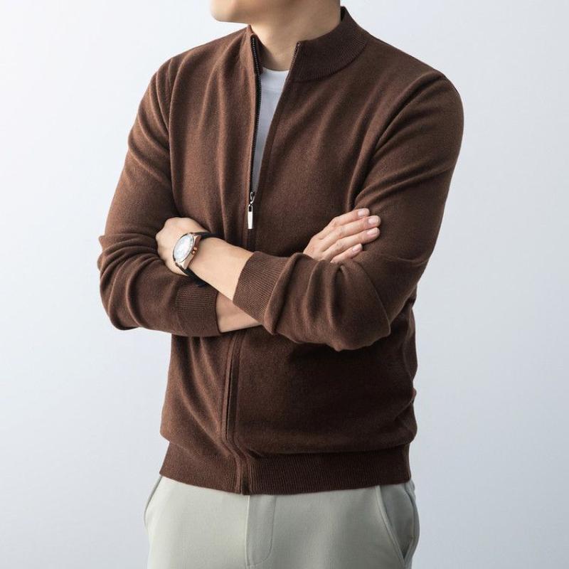 Повседневный вязаный кардиган с воротником-стойкой, мужская одежда, стильная застежка-молния, осень-зима, винтажный, однотонный, базовый, с длинным рукавом, свитера