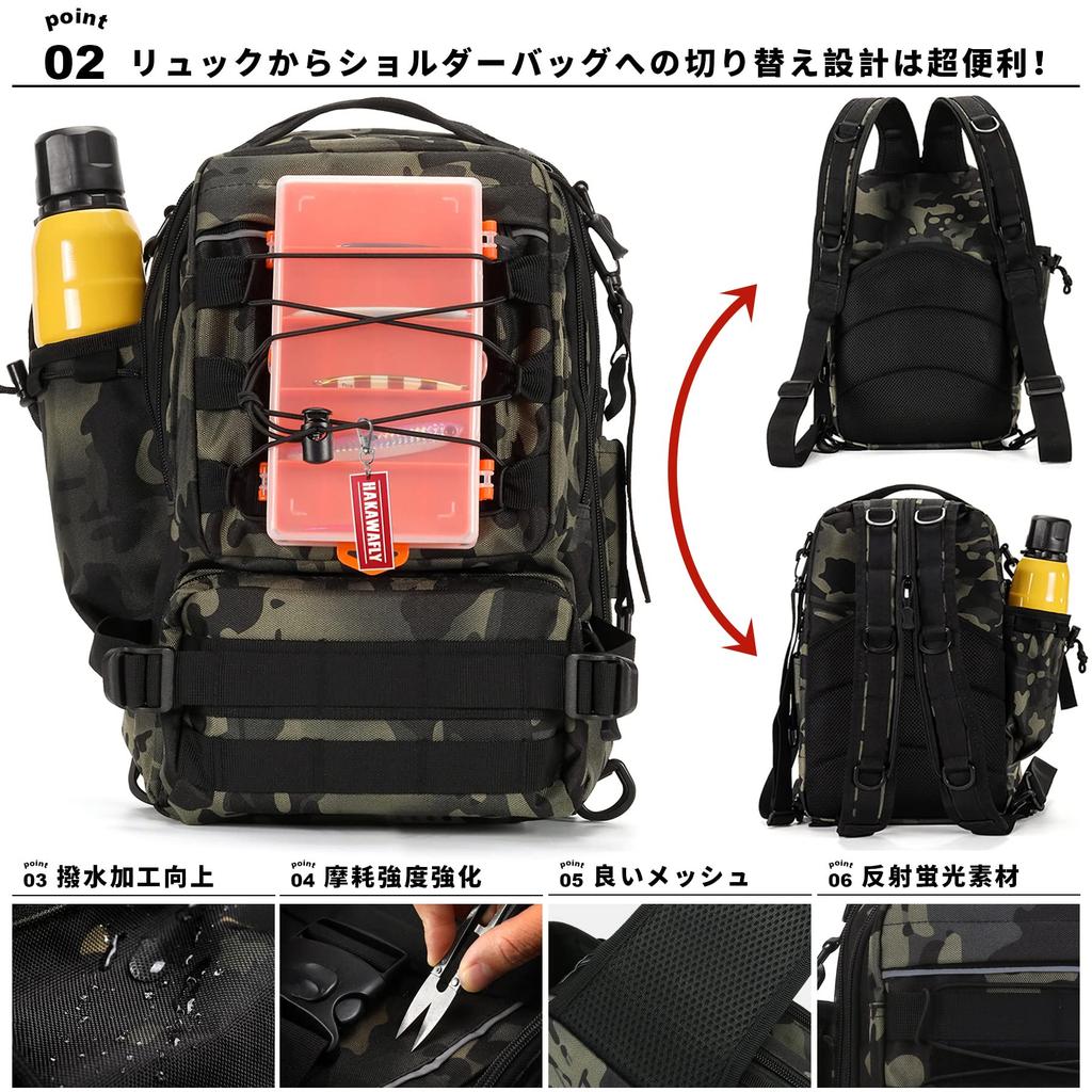 [Super Convenient Design: Converts from a Backpack to a Shoulder Bag!] The zippered shoulder strap makes it extremely convenient for those who prefer both backpack and shoulder bag styles. [Weight] 850g [Overall Dimensions] 38cm H x 23cm W x 15cm D [3 Main Pockets] [2 Front Pockets] [3 Side Pockets] [Back Pocket] [Large Capacity]: The main pocket can hold approximately 4-5 medium-sized boxes (approximately 24x12cm). The backpack is designed with numerous pockets. A hidden zippered pocket on the back is perfect for storing valuables. Dedicated pockets are conveniently located for water bottles, pliers, pliers, and fishing grips. The dedicated fishing bag features numerous pockets to ensure a comfortable fishing experience. The large 25L capacity allows you to store not only your swimsuit and clothes, but also towels. The shoulder strap can be extended from 85-114cm, and the waist belt can be adjusted from 5-97cm.