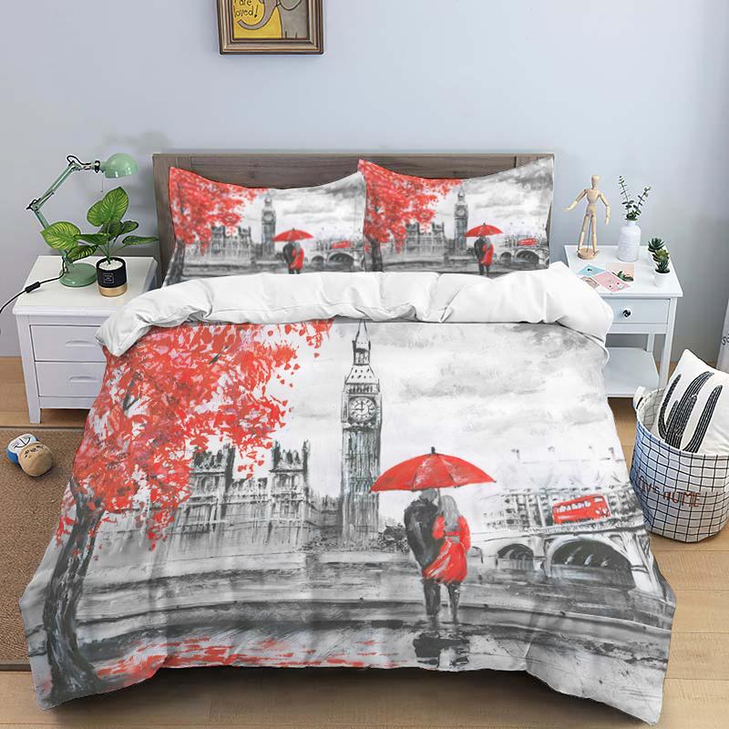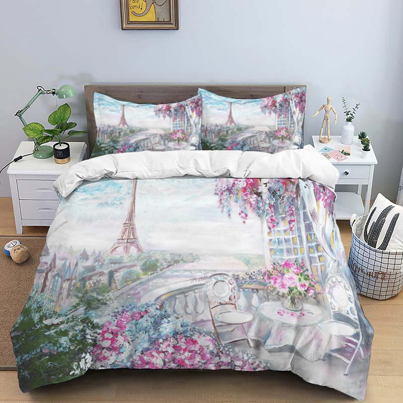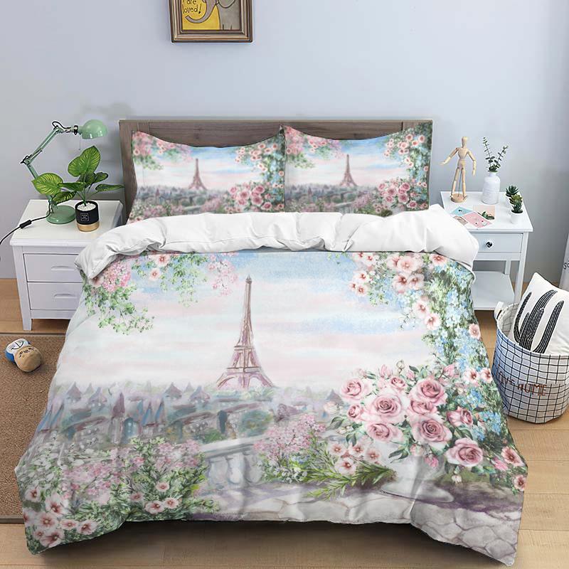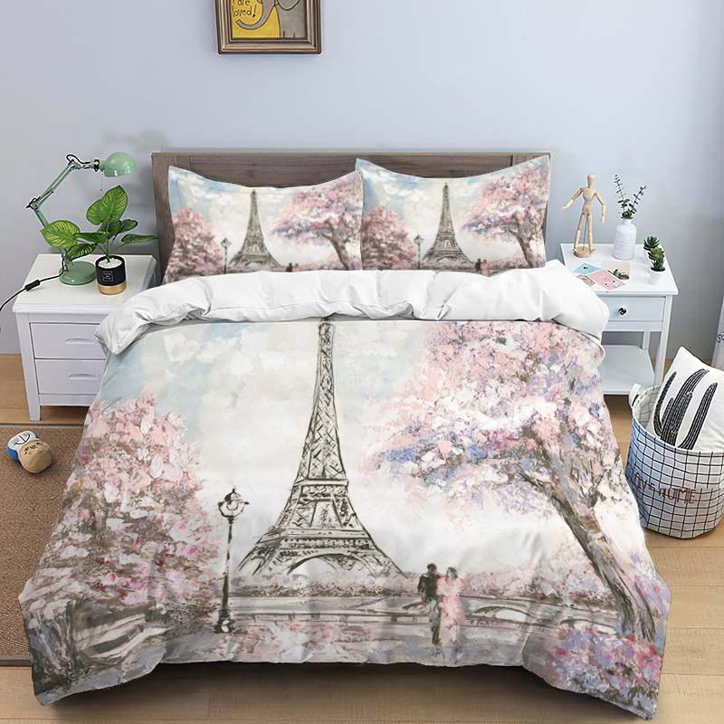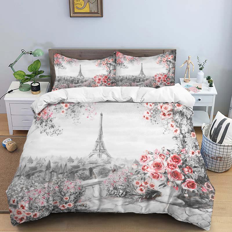 Набор постельного белья из 3 предметов Розовый Париж Городской пейзаж Принт Эйфелевой башни Уютный пододеяльник Размер Кинг, Квин, Одинарный Подарок на день рождения Декор для спальни