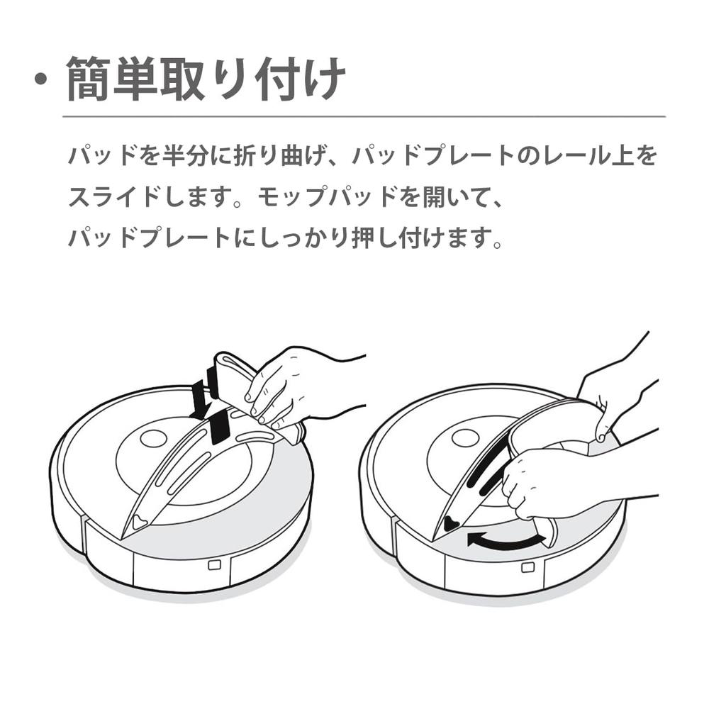 Compatible mop pad for Roomba Combo 10 Max / Combo j9+ SD / Combo j9+ / Combo j7+. Compatible models: Roomba Combo 10 Max / Combo j9+ SD / Combo j9+ / Combo j7+. Compatible with the vacuum cleaner's high-speed vibration and weighted wet mopping capabilities, it easily removes stubborn dirt. Made with high-density, high-quality fibers, this thick mop provides excellent absorbency and adheres firmly to the floor for reliable wiping. The mop cloth easily slides along the mounting grooves. The high-quality Velcro fasteners retain their shape even after multiple washes, making it reusable. Its ability to be washed in bulk makes it an essential item for those who use the mopping function daily. Note: If the mop cloth is heavily soiled, wet mopping performance may be affected. For optimal cleaning performance, we recommend replacing the mop cloth every 3 to 6 months.