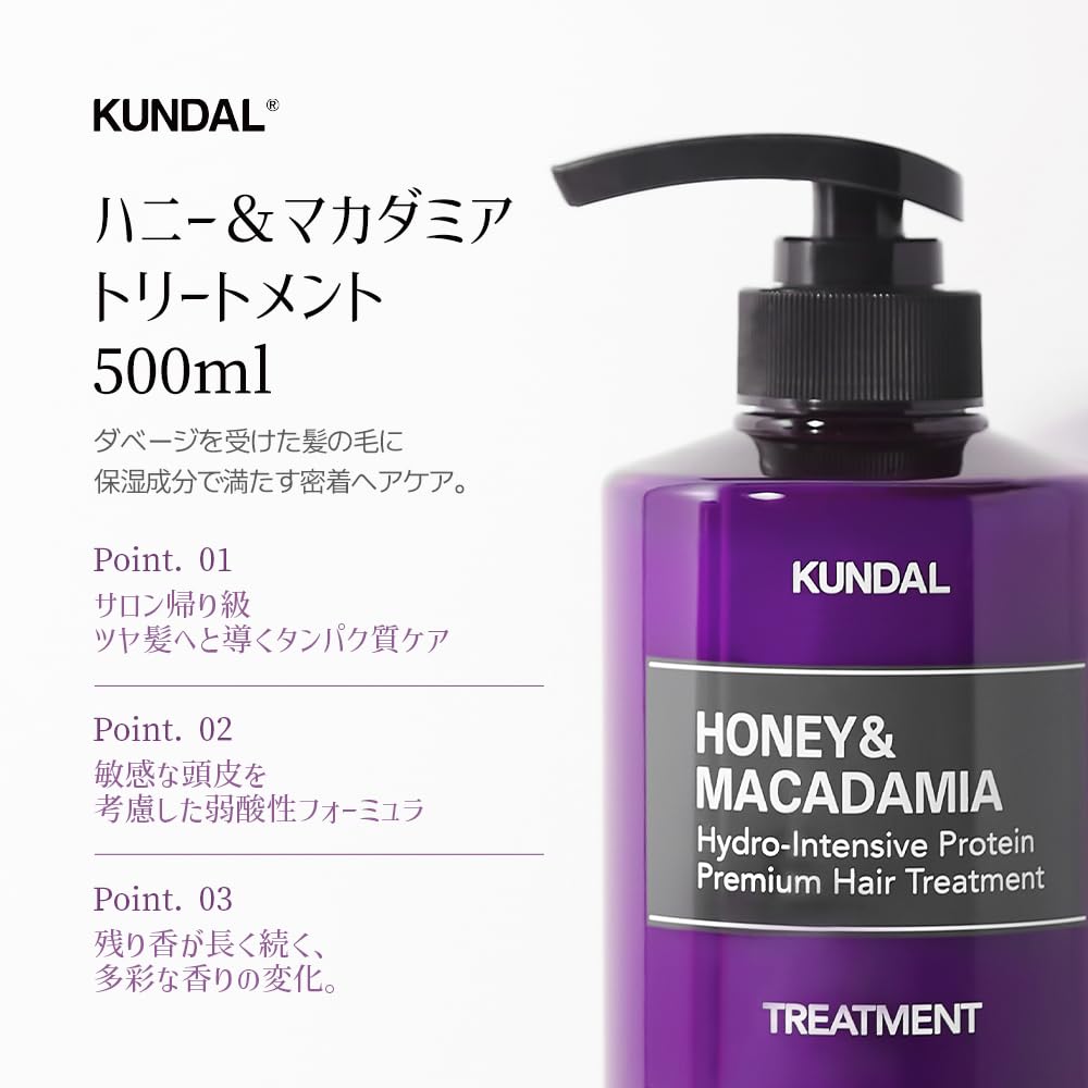 [Мед и макадамия] Слабокислая формула средств для ухода за волосами Kundal разработана для поддержания здоровья кожи головы после мытья, а их мягкая текстура привлекательна.. Формула с экстрактом меда и экстрактом семян макадамии увлажняет и защищает кожу головы от сухости.