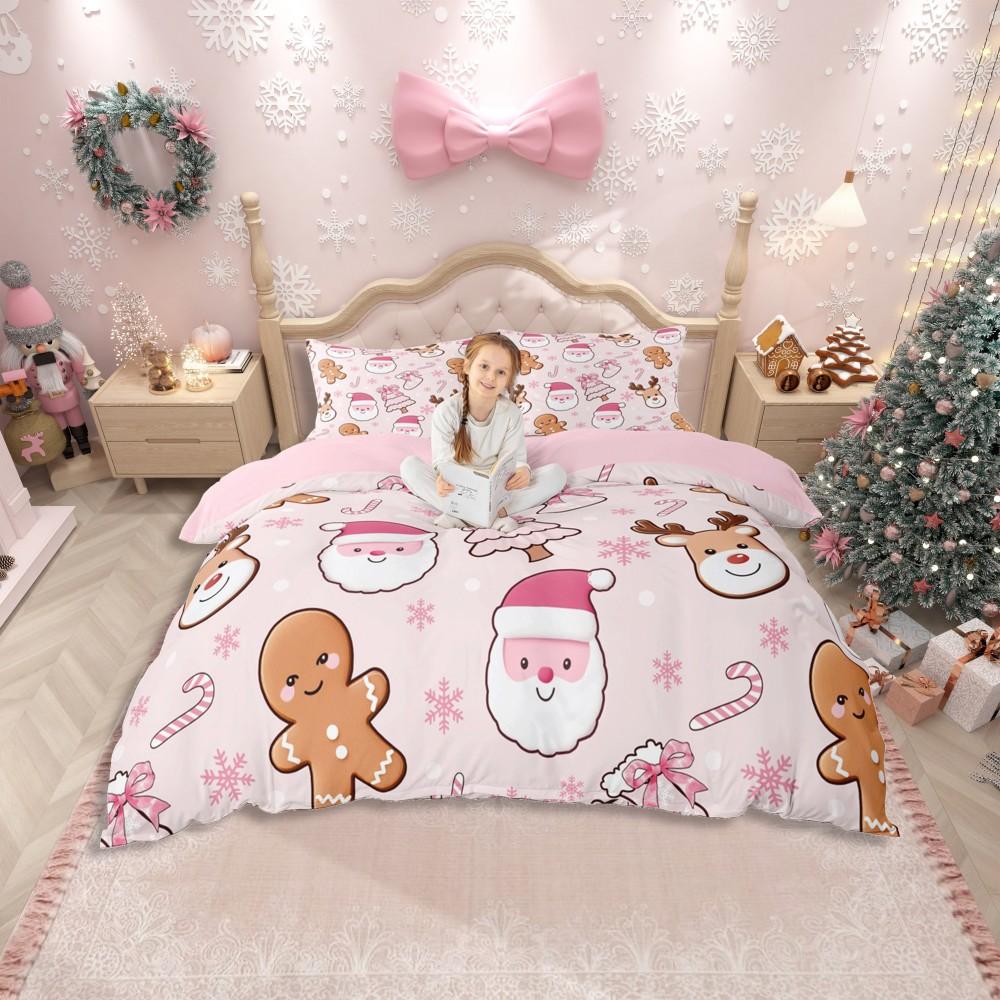 Homewish Милый комплект пододеяльника с Санта-Клаусом для подростка, Рождественский комплект постельного белья со снеговиком и оленями, Розовый лоскутный комплект для кровати в клетку