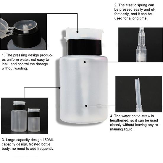 Разработанный с головкой насоса, который более удобен и портативный для вас, чтобы работать для прессования, он может хранить жидкость для макияжа и очищающее средство для удаления ногтей для использования,