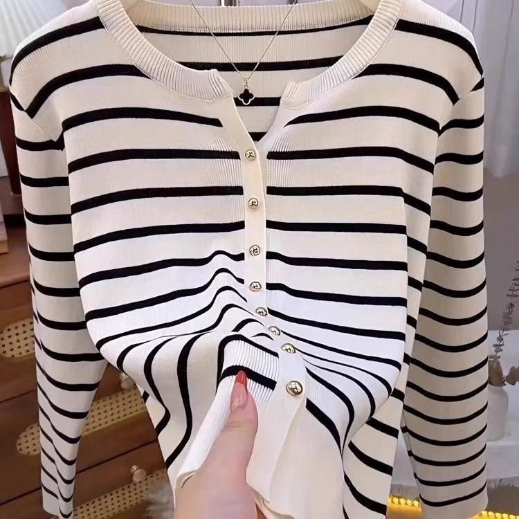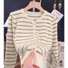 Осень новый короткий кардиган полосатый модный женский с круглым вырезом вязаный свитер с длинным рукавом базовая рубашка прилив