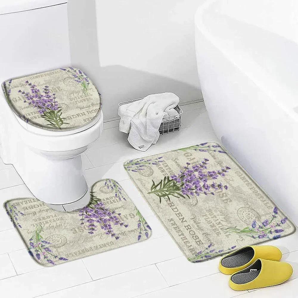Purple Lavender Bath Mat Set Nature Flowers Plants Butterfly Modern Home Carpet Bathroom Decor Non-Slip Rugs Toilet Lid Cover