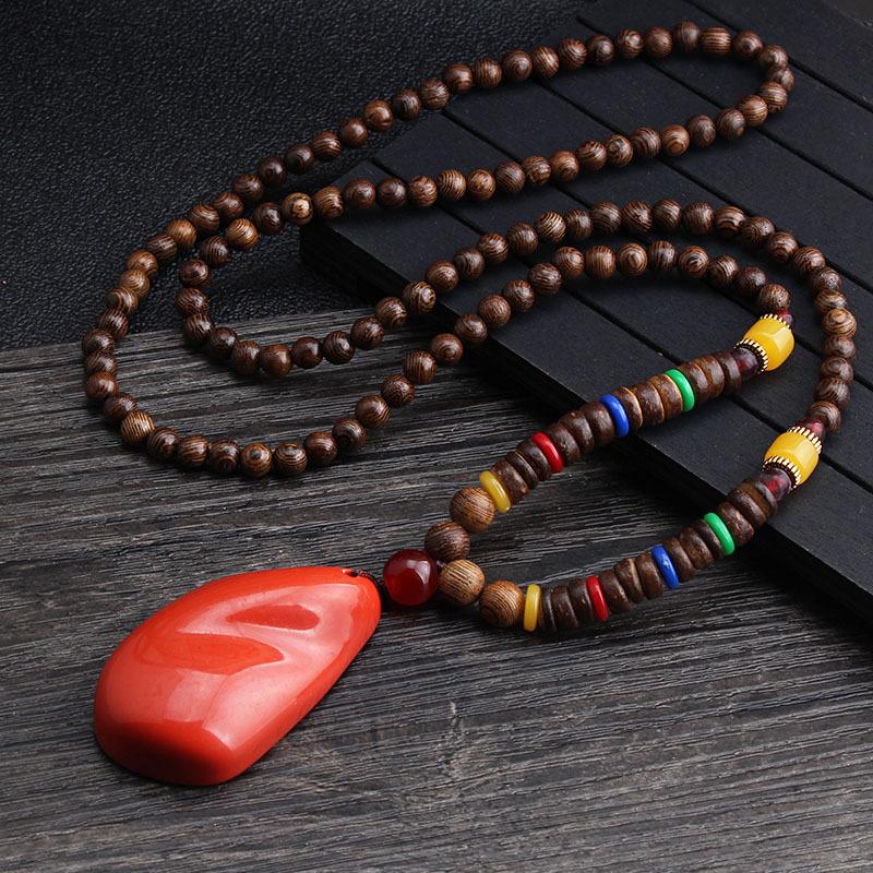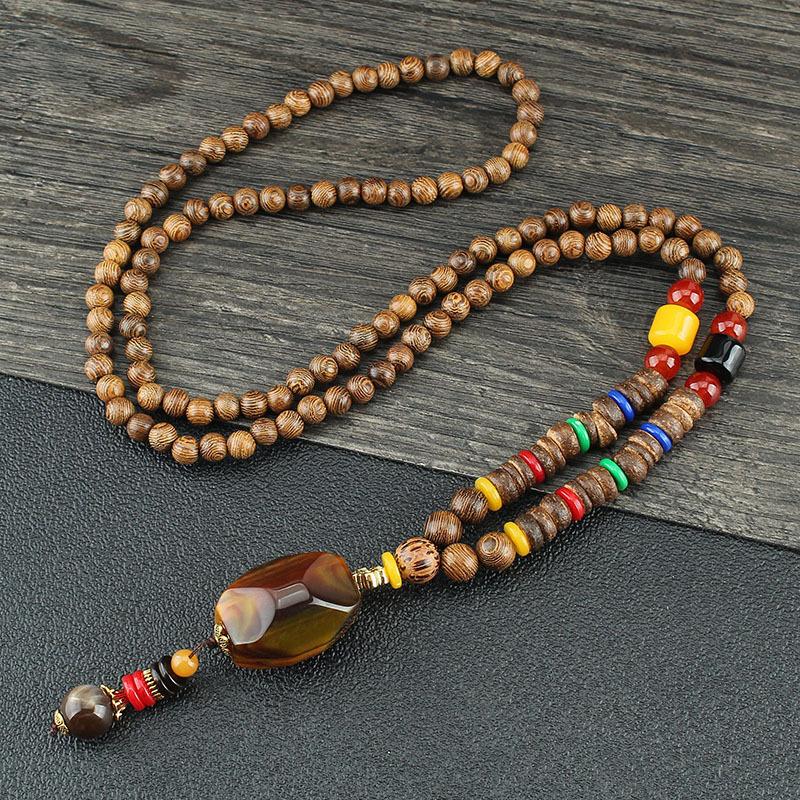 Винтажное ожерелье из буддийских молитвенных бусин ручной работы, с деревянными бусинами, подвеской и длинным украшением в этническом стиле «рыбья кость».