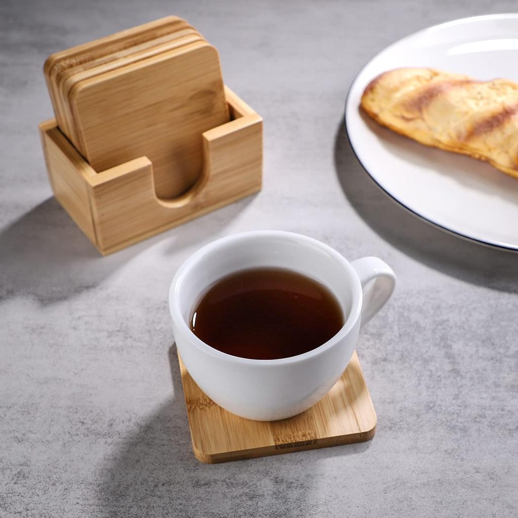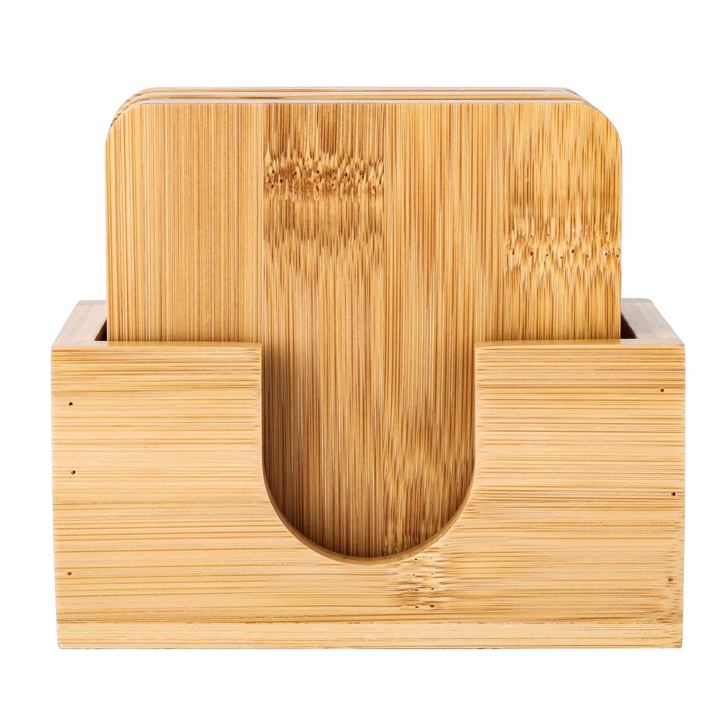 Set of 6 Natural Bamboo Coasters, Cup Pads, and Cup Mats with Bamboo Storage Case. Insulated, Quick-Drying, Non-Slip, 9.5cm x 9.5cm.