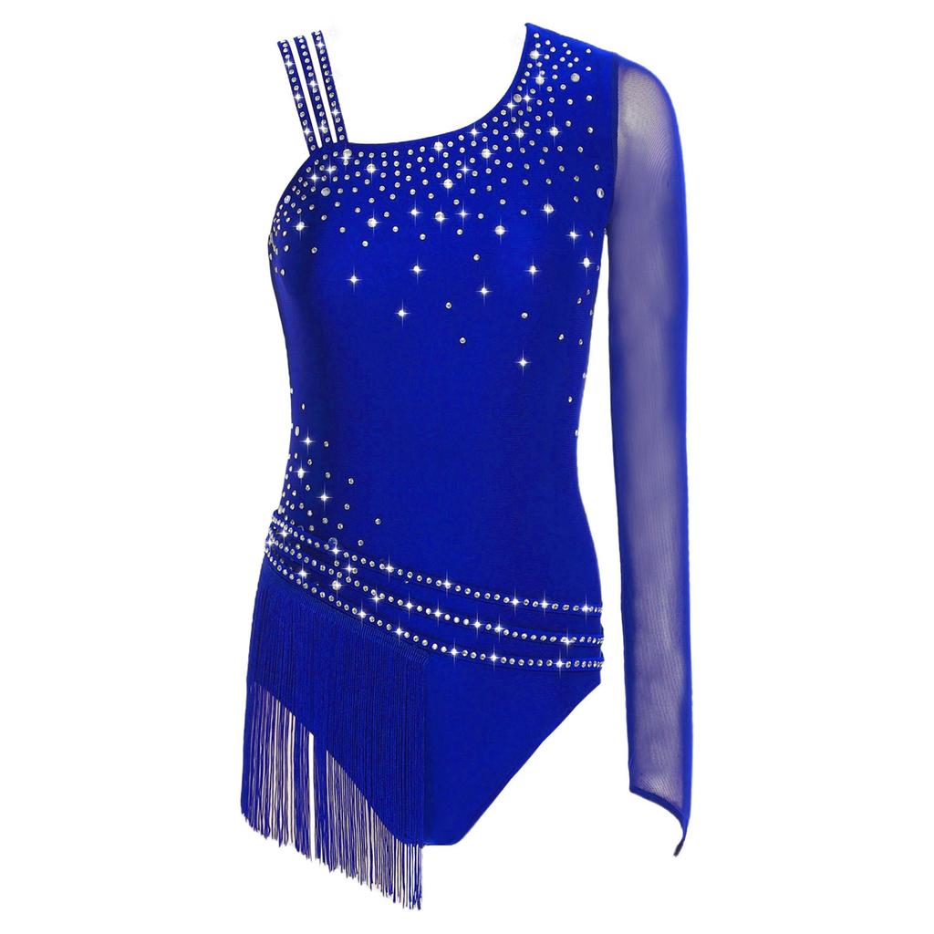 Женский гимнастический купальник с асимметричным плечом, блестящими стразами, бахромой с кисточками, боди для латиноамериканских танцев