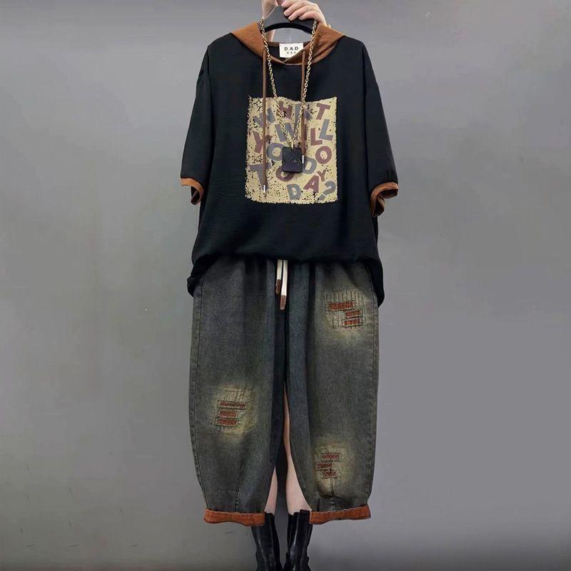 Костюм большого размера, повседневный, индивидуальный, модный, с капюшоном, свободный, с принтом, с короткими рукавами, с девятью точками, из двух частей